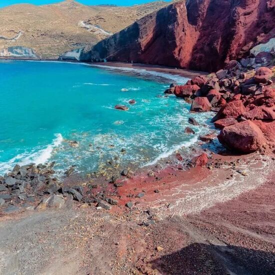 Dann besuchen Sie Santorins bekanntesten Strand, den Red Beach, ein seltenes Naturphänomen, und machen Sie herrliche Fotos von den rötlichen Klippen und der vulkanischen Umgebung.
