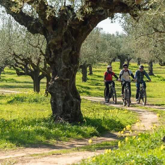 - Fahren Sie durch uralte Olivenhaine: Fahren Sie auf sanften Steigungen und grünen Wegen durch ruhige Olivenhaine mit jahrhundertealten Bäumen.