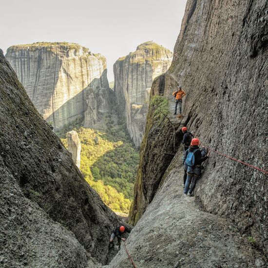 Diese Wander- und Klettertour zum Großen Heiligen führt Sie auf den höchsten aller Meteora-Felsen, etwa 400 Meter über der Stadt Kalampaka, durch einen uralten gewundenen Pfad auf den Felsen von Great Saint, einem riesigen Felskomplex, der vor Tausenden von Jahren ein integraler Bestandteil der antiken Befestigungsanlagen der darunter liegenden Stadt war.