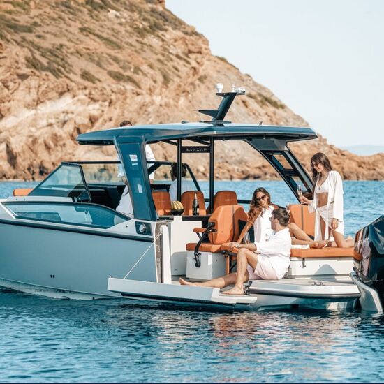 Builder: SAXDOR Naval Architect: Sakari Mattila Model: SAXDOR 320 GTO Year Built: 2023 (August) Length Overall: 32ft / 10.3m Beam Overall: 10.2ft / 3.1m Draught: 3ft / 1m Displacement: 4800kg/ 10582,18 lb approx. Engines: 2 x 300 Verado V8 (white color) Cruising Speed: 30 knots Max Speed: 45 knots Consumption: 4lit / mile (Petrol) Tank Capacity Fuel: 428L Tank Capacity Water: 117L Berths: 2 Bathrooms/shower: 1 Deck guests: 10 + skipper Navigation & Electronics: Simrad Information Display with 2 x 12 inch displays with a glass helm, 2 x GPS plotter, AIS, Radar, VHF, bow thruster, Automatic trim tabs, underwater lights, 5G Broadband Internet, Inverter Interior Layout: 1 double cabin with toilet and shower Interior Comfort: Curtains in front cabin and mosquito nets Exterior Comfort: Twin Sofa with aft Sunbed, Deck and bathroom shower, Soft deck flooring, deck lights, Extra deluxe equipment: "Smoked Orange" upholstery, electrical fresh water toilet, extra 2 fridges in wetbar, advanced audio package with a enhanced Fusion radio, amplifier and 6 speakers, Courtesy lights, Solar panels, beach towels, stern sun tent cover, deluxe bath amenities. Water Toys: Snorkeling equipment, swimming water noodles, 2 x SeaDoo Sea scooters,1 x SUP