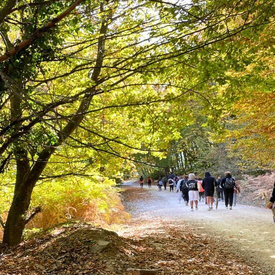 Die Wanderung führt Sie auf einem traditionellen, mit Steinen gepflasterten Weg durch den dichten Buchenwald zur Hortiatis-Berghütte, etwa 4 Kilometer vom Ausgangspunkt entfernt. Hier werden wir eine entspannende Pause einlegen, in der wir, falls die Schutzhütte geöffnet ist, einen Kaffee oder einen Snack genießen können, umgeben von der natürlichen Schönheit der Gegend.