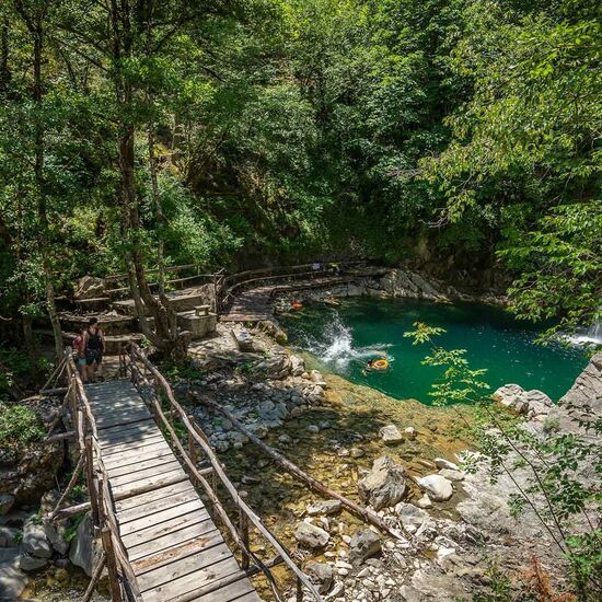 - Wandern Sie einen 1 km langen Pfad zum Iliochori-Wasserfall, zum Iliochori-Wasserfall, um im kristallklaren Wasser des Flusses zu schwimmen