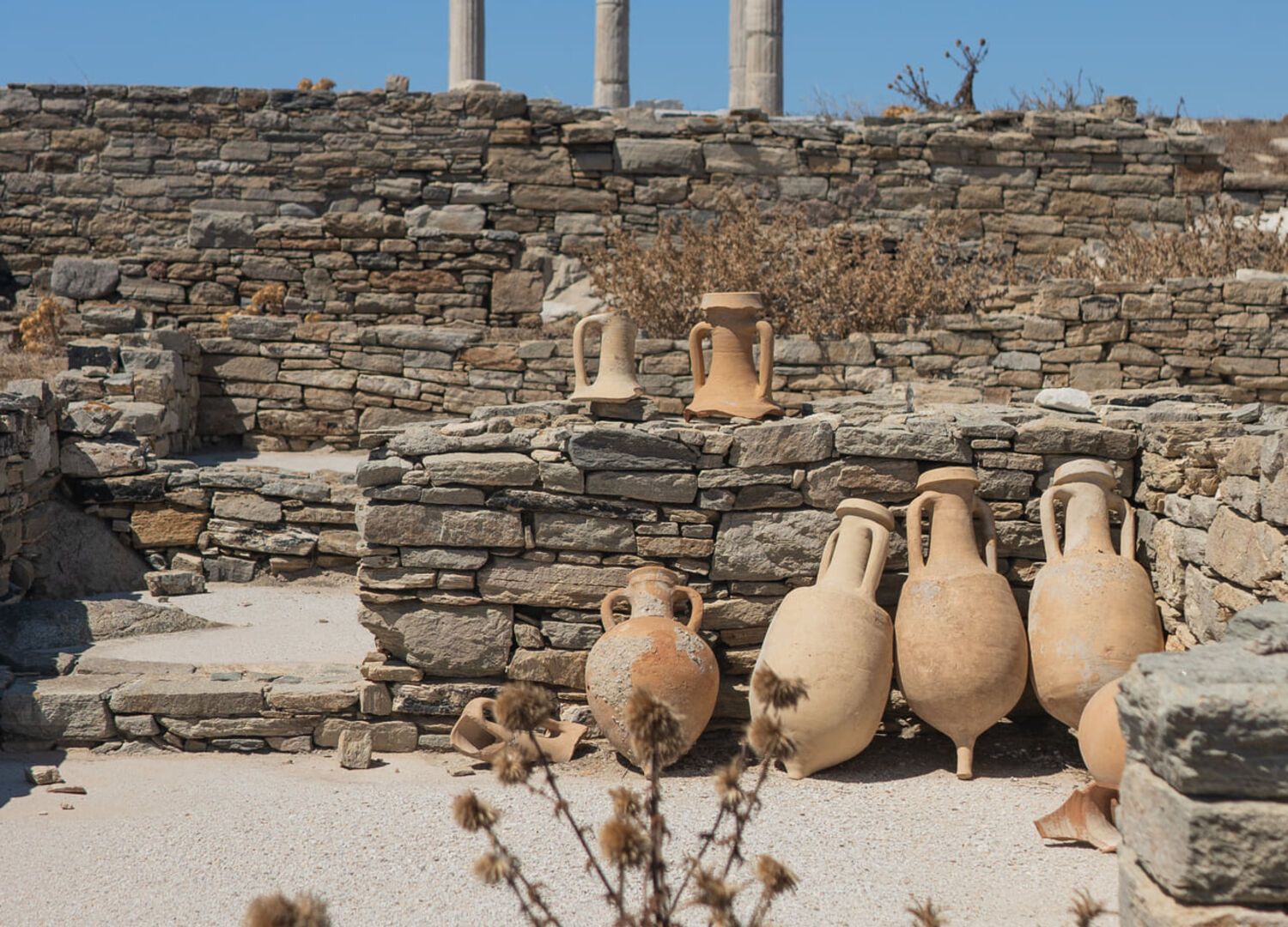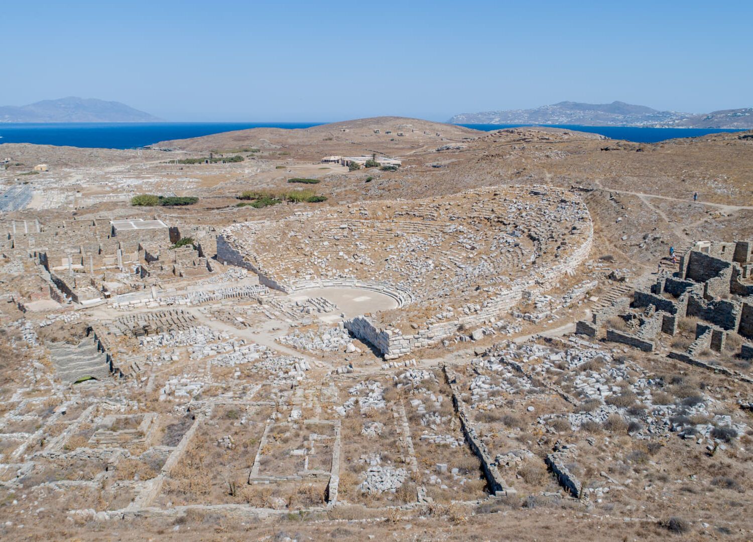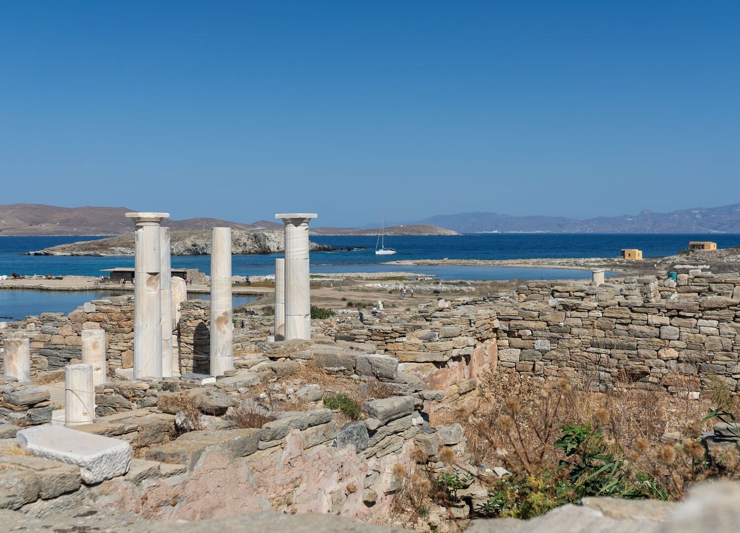 Delos ist die größte archäologische Ausgrabungsstätte Griechenlands und die kleinste Insel, auf der sich einst ein Stadtstaat befand. Hier soll Leto (die von Zeus geschwängert und von der eifersüchtigen Hera aus dem Olymp verbannt wurde) Artemis und Apollo zur Welt gebracht haben. Die ersten Siedlungsspuren stammen aus der zweiten Hälfte des 3. Jahrtausends v. Chr. und es gibt Überreste aus mykenischer Zeit (1750 bis 1050 v. Chr.). Im 8. Jh. v. Chr. wurde ein riesiges apollinisches Heiligtum errichtet, das Pilger und (ab dem 7. und 6. Jh. v. Chr.) Geschenke, Statuen und andere Opfergaben zu Ehren Apollos anzog. Und ab dem 4. Jh. v. Chr. war Delos ein wohlhabender Handelshafen am Mittelmeer, in dem Künstler, Bankiers und Reeder in Villen lebten, die reich mit Fresken und Mosaikböden verziert waren. Ihre Bedeutung war so groß, dass die umliegenden Inseln als Kykladen bekannt wurden, zu denen heute Legenden wie Santorin und Mykonos gehören. Ihr Verfall begann im 1. Jh. v. Chr. und sie wurde während der Römerzeit verlassen.