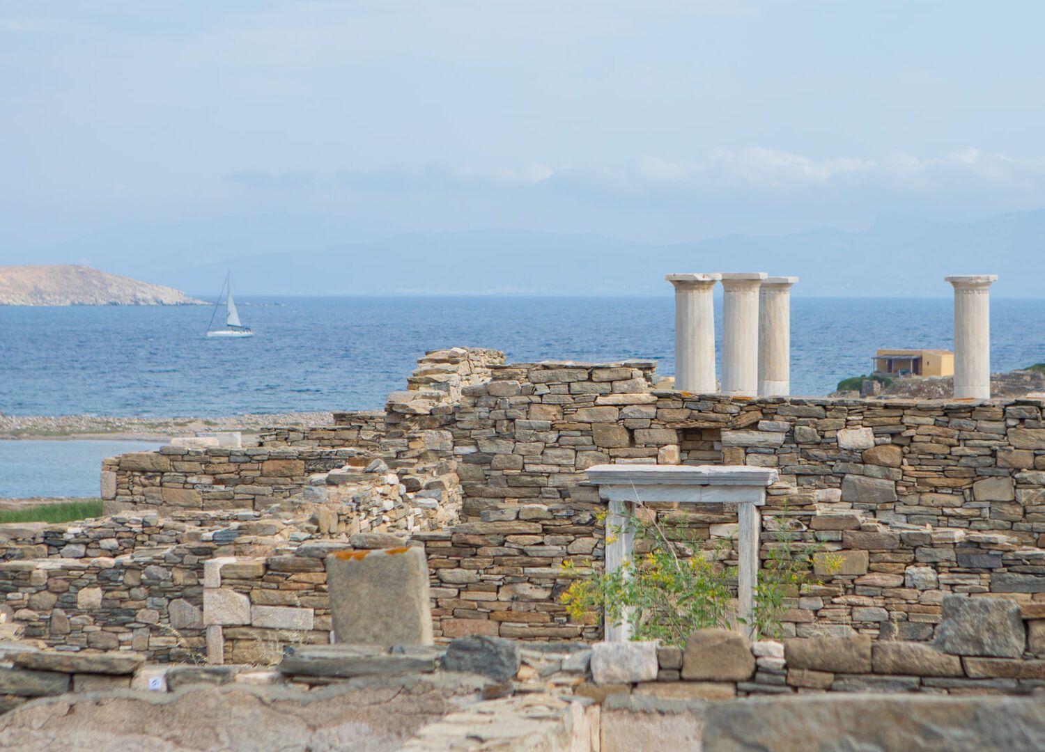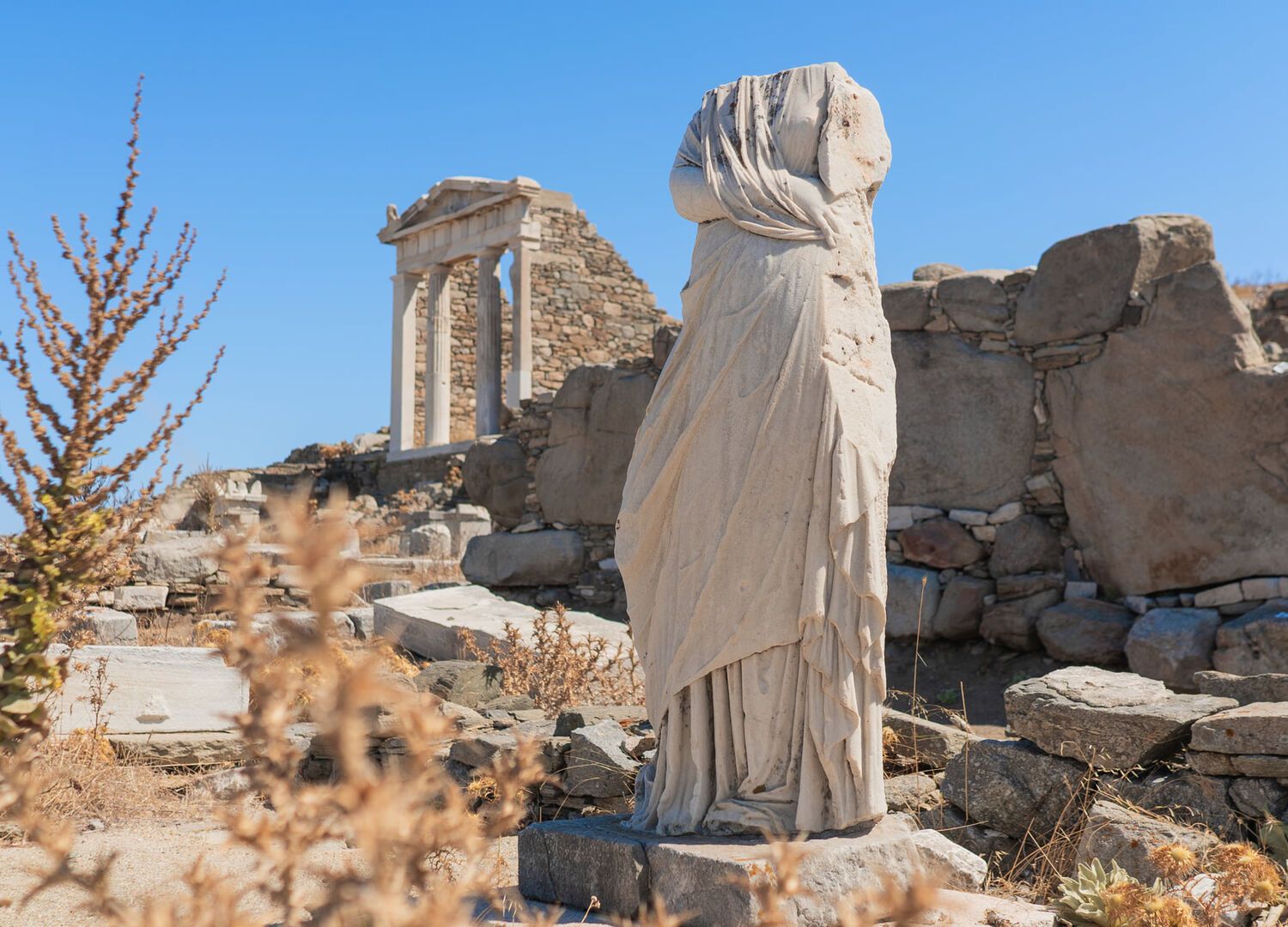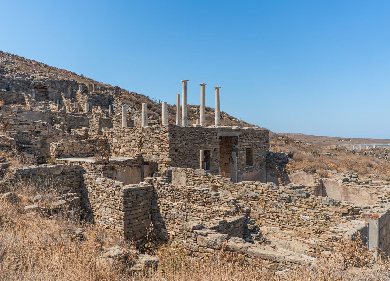 Delos ist die größte archäologische Ausgrabungsstätte Griechenlands und die kleinste Insel, auf der sich einst ein Stadtstaat befand. Hier soll Leto (die von Zeus geschwängert und von der eifersüchtigen Hera aus dem Olymp verbannt wurde) Artemis und Apollo zur Welt gebracht haben. Die ersten Siedlungsspuren stammen aus der zweiten Hälfte des 3. Jahrtausends v. Chr. und es gibt Überreste aus mykenischer Zeit (1750 bis 1050 v. Chr.). Im 8. Jh. v. Chr. wurde ein riesiges apollinisches Heiligtum errichtet, das Pilger und (ab dem 7. und 6. Jh. v. Chr.) Geschenke, Statuen und andere Opfergaben zu Ehren Apollos anzog. Und ab dem 4. Jh. v. Chr. war Delos ein wohlhabender Handelshafen am Mittelmeer, in dem Künstler, Bankiers und Reeder in Villen lebten, die reich mit Fresken und Mosaikböden verziert waren. Ihre Bedeutung war so groß, dass die umliegenden Inseln als Kykladen bekannt wurden, zu denen heute Legenden wie Santorin und Mykonos gehören. Ihr Verfall begann im 1. Jh. v. Chr. und sie wurde während der Römerzeit verlassen.