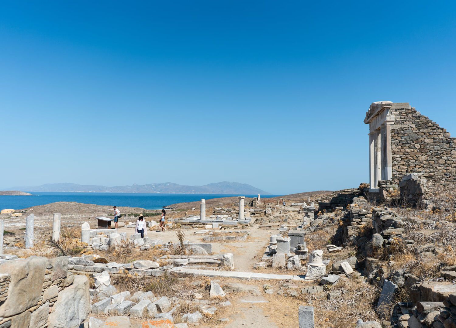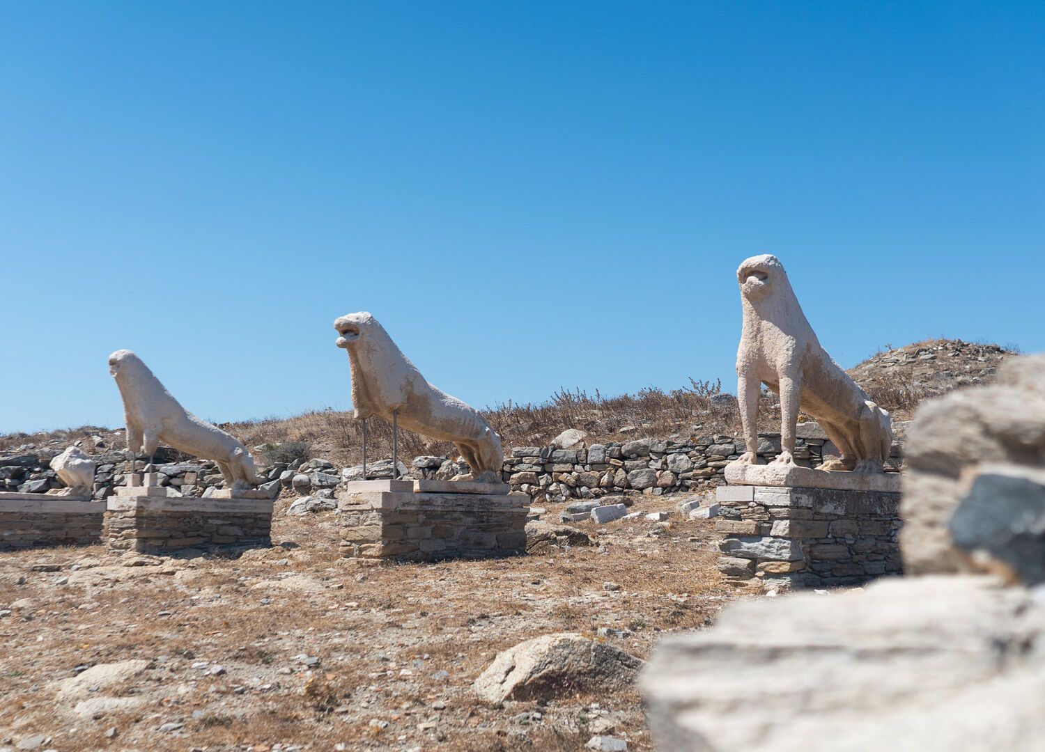 Die archäologische Stätte erstreckt sich fast über die gesamte Insel. Der Delians-Tempel (erbaut zwischen 476-314 v. Chr. und ein Beispiel für dorische Architektur) ist der größte der drei Apollon geweihten Tempel und es gibt auch einen Hera-Tempel. Die viel fotografierte Löwenterrasse war ein Geschenk der Naxier und das antike Theater bietet einen wunderbaren Blick auf das Meer. Außerdem gibt es eine noch nie dagewesene Anzahl von Heiligtümern, die ausländischen Gottheiten gewidmet sind (die Tempel für die ägyptischen Götter Sarapis, Isis und Anubis und die syrischen Götter Haadad und Atargatis) und sogar die Überreste einer Synagoge, die den kosmopolitischen Charakter des antiken Delos unterstreichen.