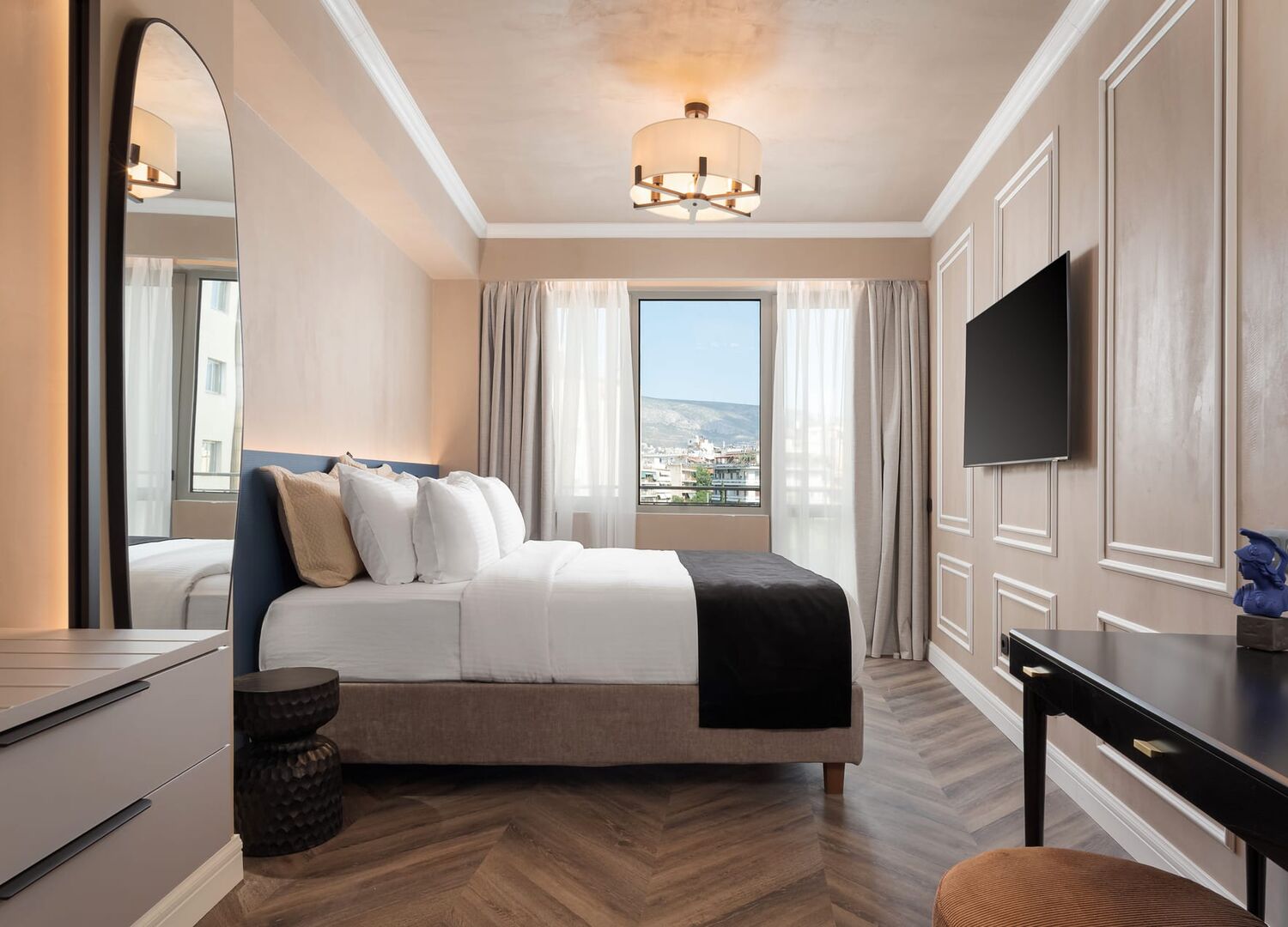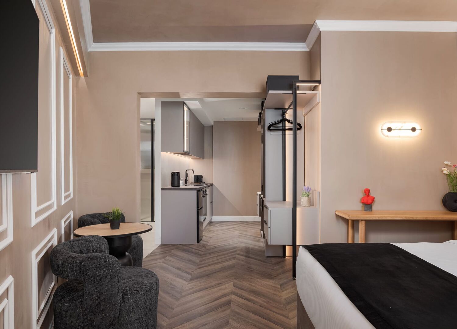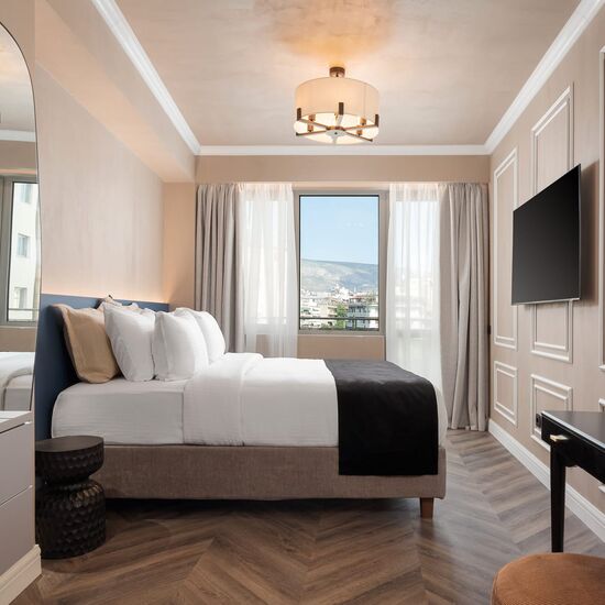 The Aphrodite Suite is a bright and elegant 1-bedroom apartment with a full ensuite bathroom and a harmonious open layout. The modern kitchen allows for convenient in-room dining, while the mountain-view balcony adds a natural and relaxing element to your urban stay.
