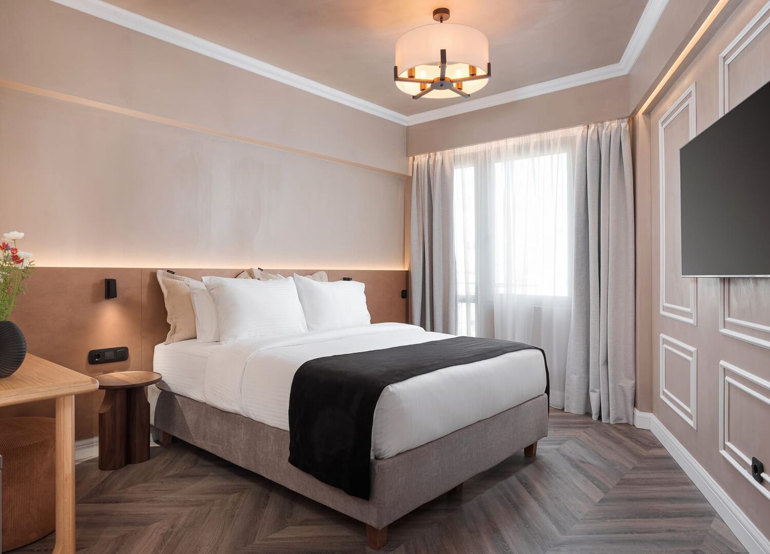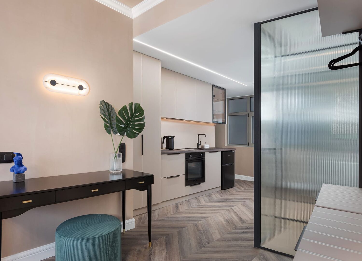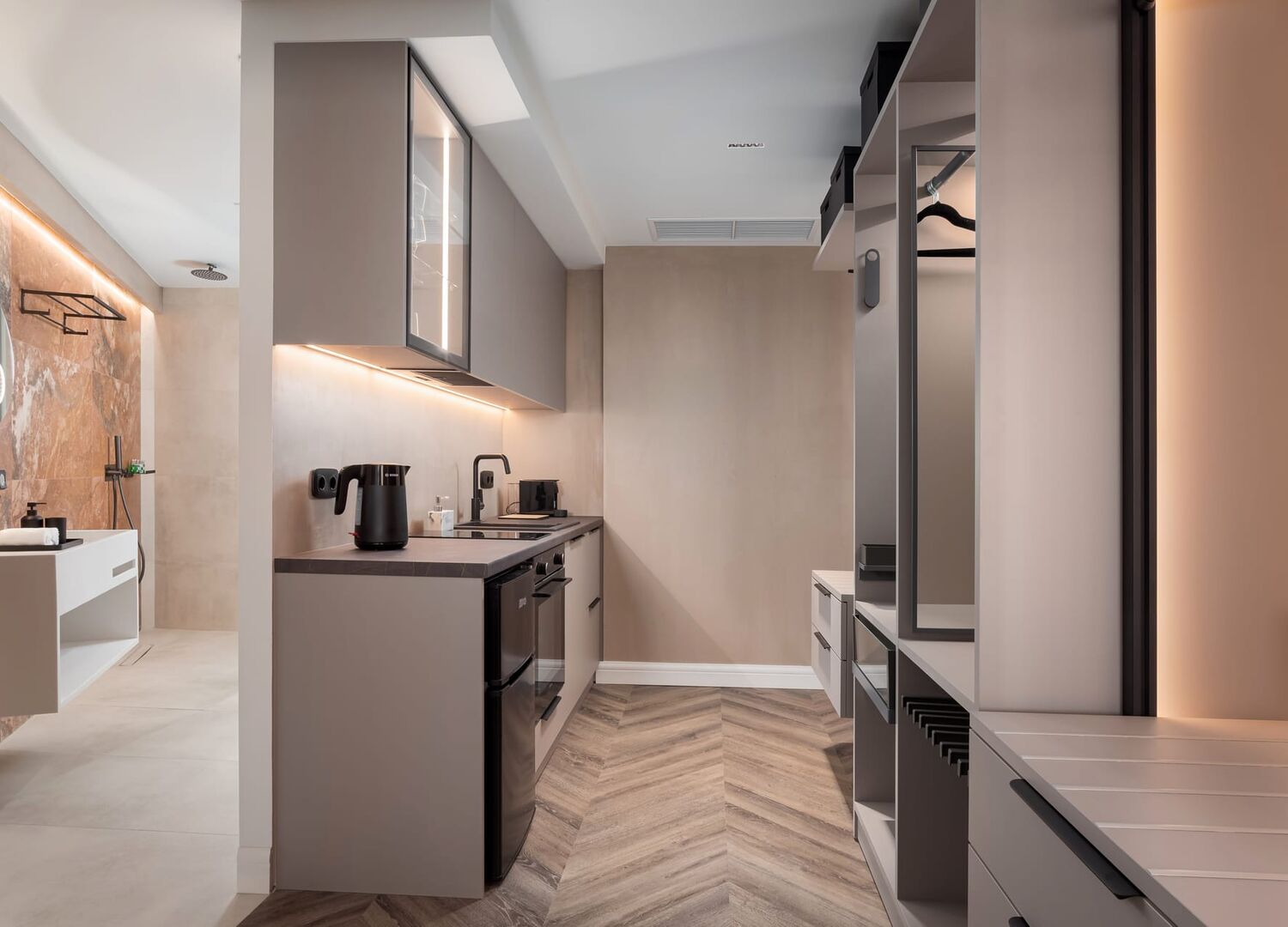 The Aphrodite Suite is a bright and elegant 1-bedroom apartment with a full ensuite bathroom and a harmonious open layout. The modern kitchen allows for convenient in-room dining, while the mountain-view balcony adds a natural and relaxing element to your urban stay.