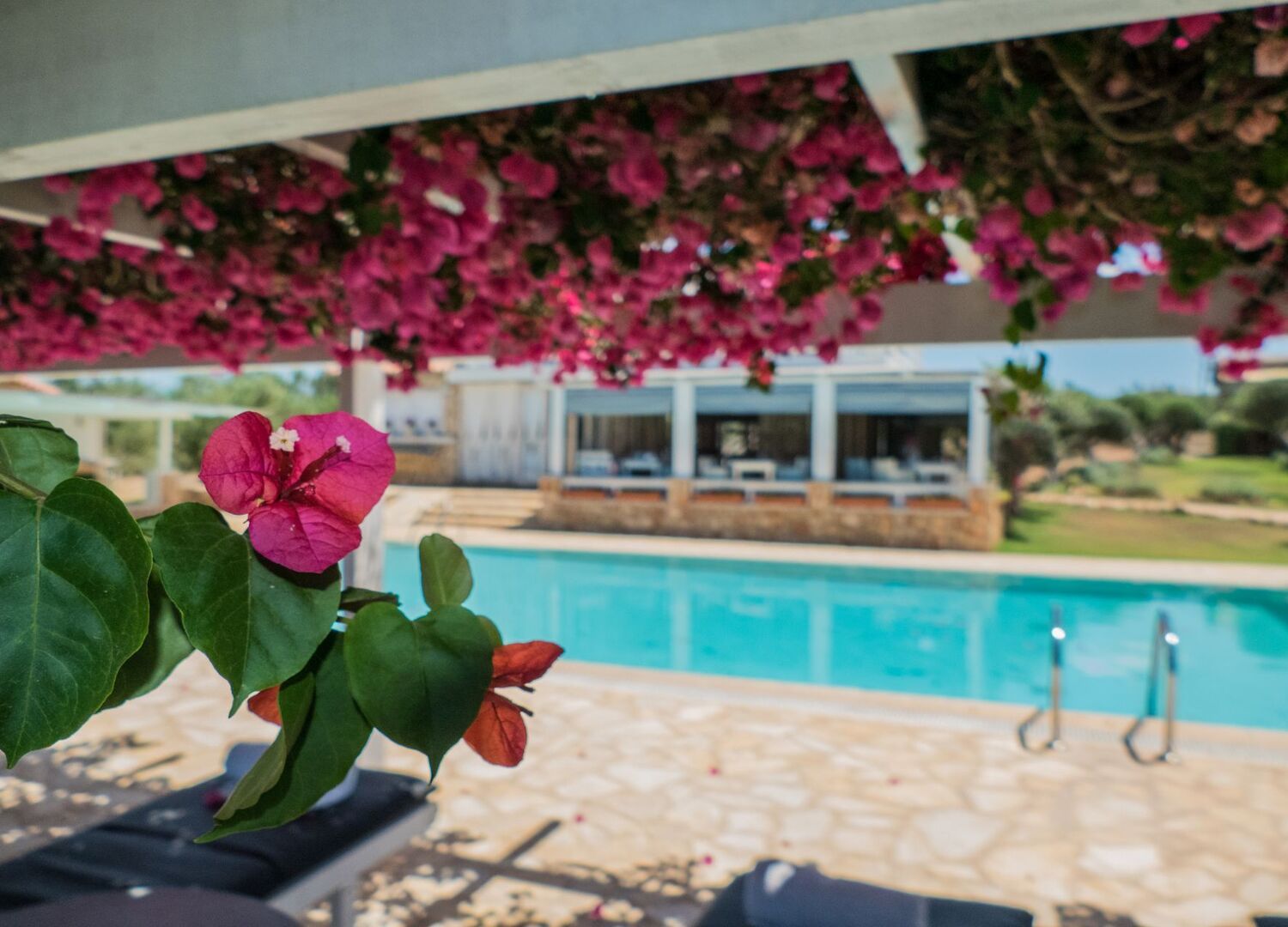 Further down from the apartments - and at a safe distance from them - you can find the central swimming pool, the bar and the restaurant. The location is rural and extremely calm, while the sea is only 500m away.