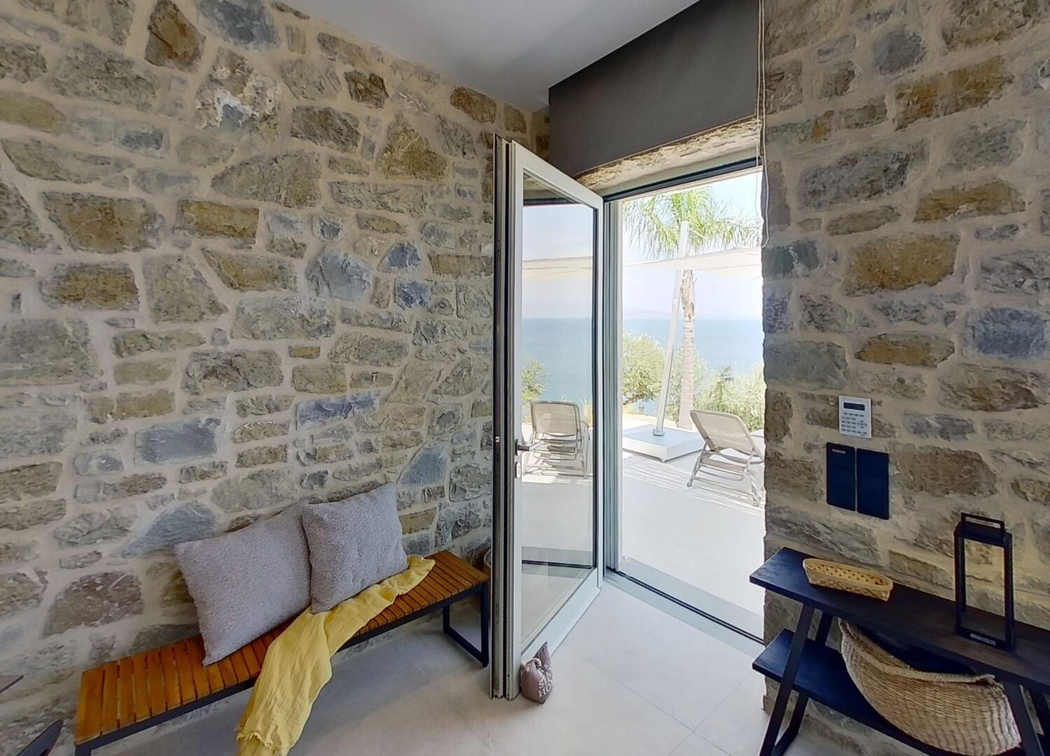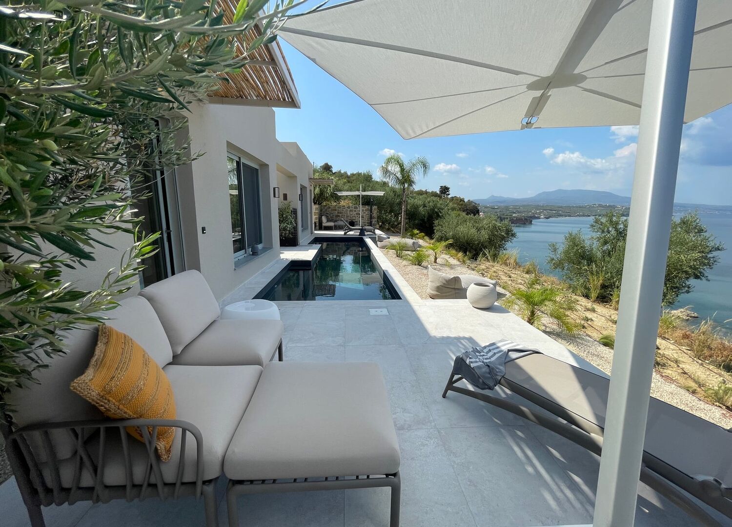 Each suite, designed for comfort and cosiness, can host up to 3 guests* and offers one bedroom, one bathroom and one kitchen/living open space. Guests also enjoy comfortable outdoors space by the 10 m saltwater pool with unlimited sea views over the Messinian bay and the Taygetos mountain range.