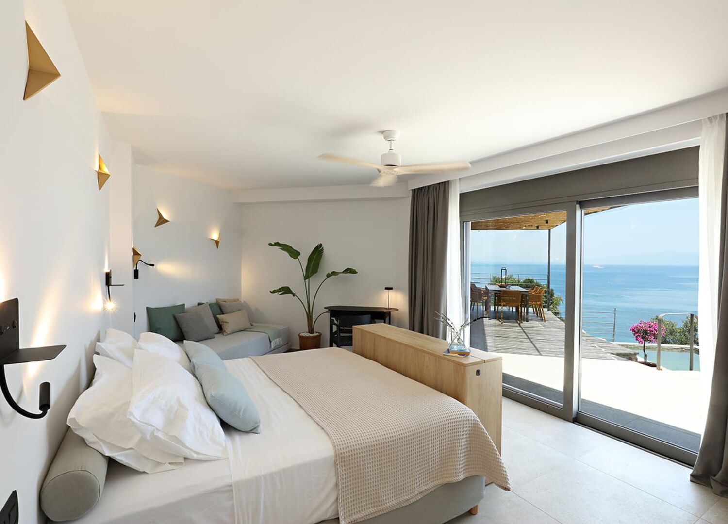 Elegant and luxurious yet warm, Villa ‘Thea’ boasts a unique 15m saltwater pool with unrivalled sea views. The expansive open-space living/dining/kitchen area with a bathroom and a bedroom in the loft, is complemented by a wing of two large bedrooms with ensuite bathrooms. Guests enjoy beautiful sea views and poolside terraces from every corner. For more than 6 guests, an additional section with living/dining/kitchenette, bedroom and bathroom is provided.