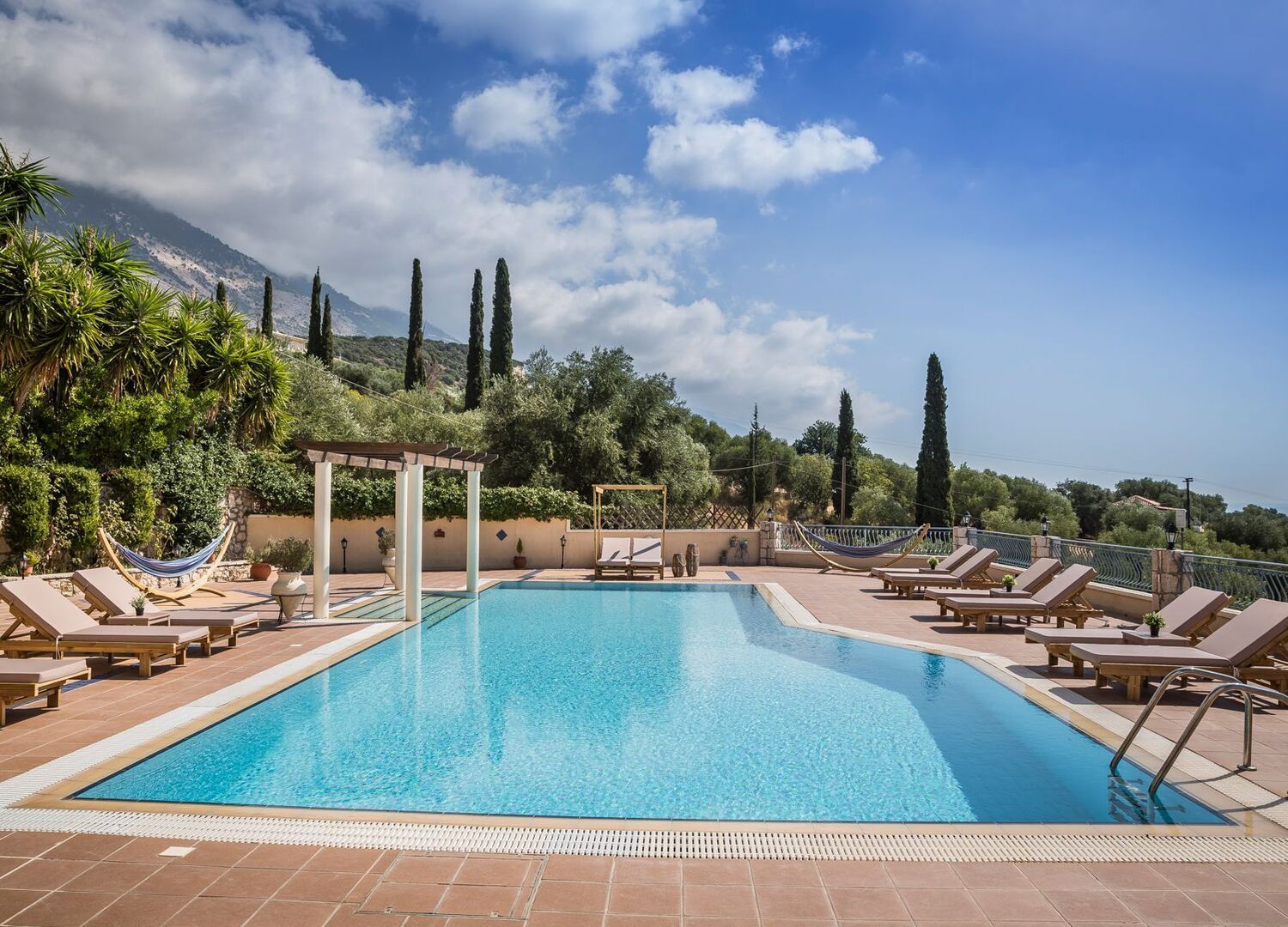 Diana Studios Kefalonia is a charming hotel located in Trapezaki, Kefalonia. The studios and apartments are decorated in soothing blue and white tones, offering panoramic sea and mountain views. Guests can enjoy the outdoor pool, air-conditioned rooms with fully equipped kitchens, TV, free Wi-Fi, and balconies overlooking the sea and countryside. A perfect choice for a relaxing and comfortable stay in Kefalonia.