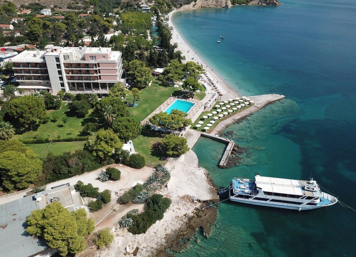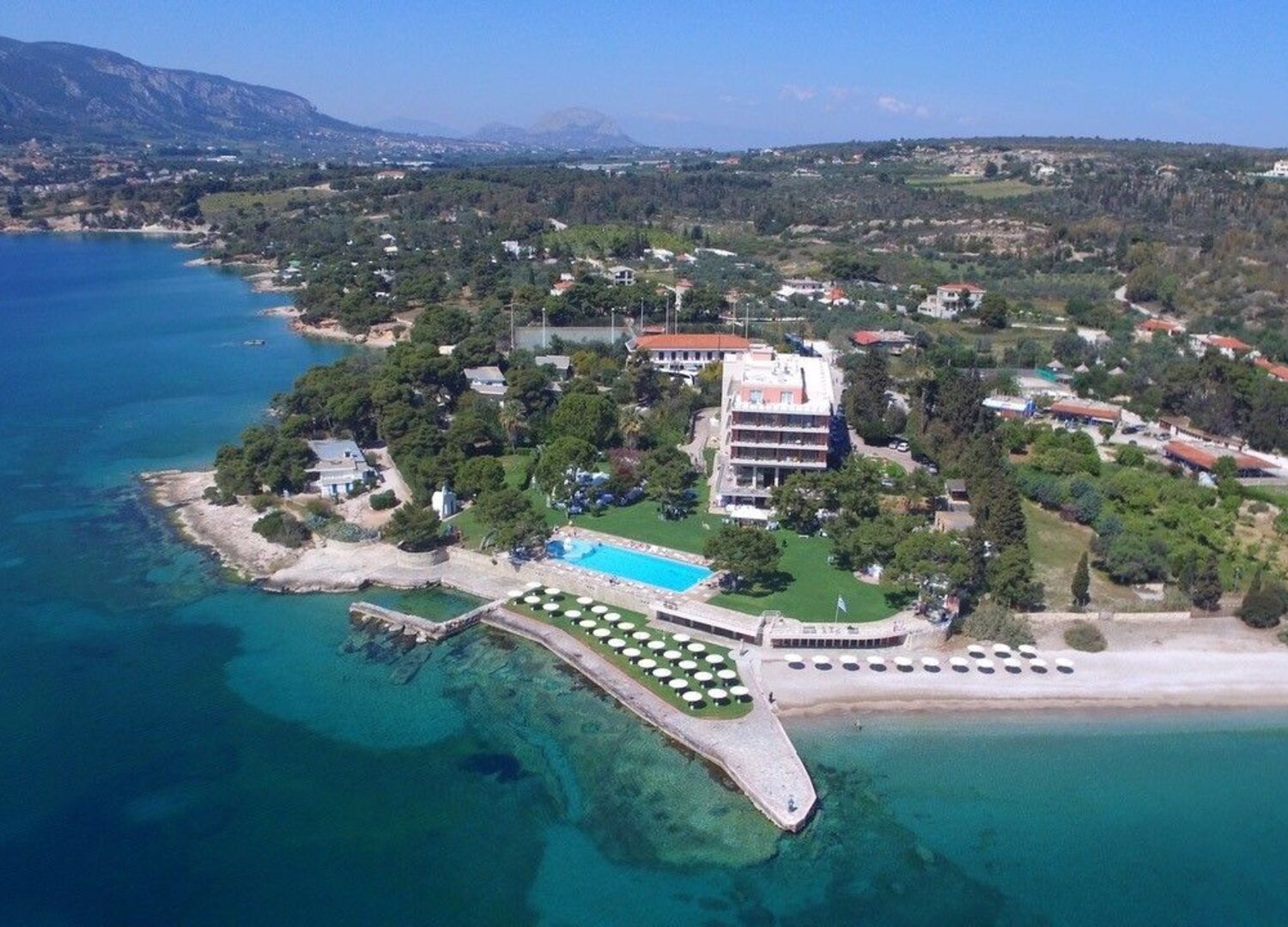 Located in Isthmia, Corinthia, Kalamaki Beach Resort is easily accessible from Athens city center and Athens International Airport (ATH). The hotel’s immediate area offers you a large choice of famous archaeological sites and attractions to visit: the theater of Epidaurus, Mycenae, Nafplio and Delphi to name a few are very close by. Beautifully furnished, the large and bright rooms boast unique sea and lush garden views. The 4 star hotel’s organized beach with grass and white pebbles and is supplemented by two swimming pools, green lawn spaces and sports facilities that include 4 tennis courts of green quartz sand (canada-tenn), a volley ball court with grass, a fitness room, a billiard table, a table tennis and a playground for children. At the Kalamaki Beach resort you will also enjoy Greek and International cuisine by our chef. Dreamy weddings and receptions are celebrated by the pool and thanks to the Homer Stathopoulos meeting room, Kalamaki Beach Resort is the perfect venue for meeting and events. With 40 + years of Greek hospitality experience, our team guarantees a blissful stay and relaxing daytrips away from the city.