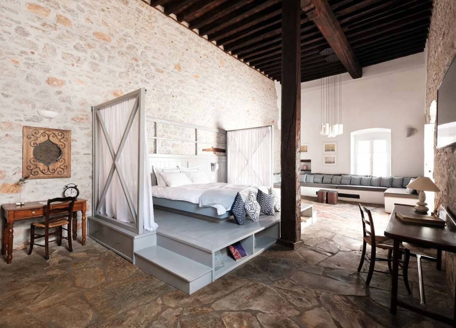 Spacious and imposing, one cannot help but noticing the place’s robust wooden beams known as “boudelia” a term used by the local seamen for the wooden poles that support boats when parked aground. The dominating elements are those of the local marble stone and wood, with its unique architecture, the Keresbino Hydra manor house carries the spirit of its past into the present, a bearer of subtle signs of its history for the guests to decipher. ell-balanced and bound within the towering walls.