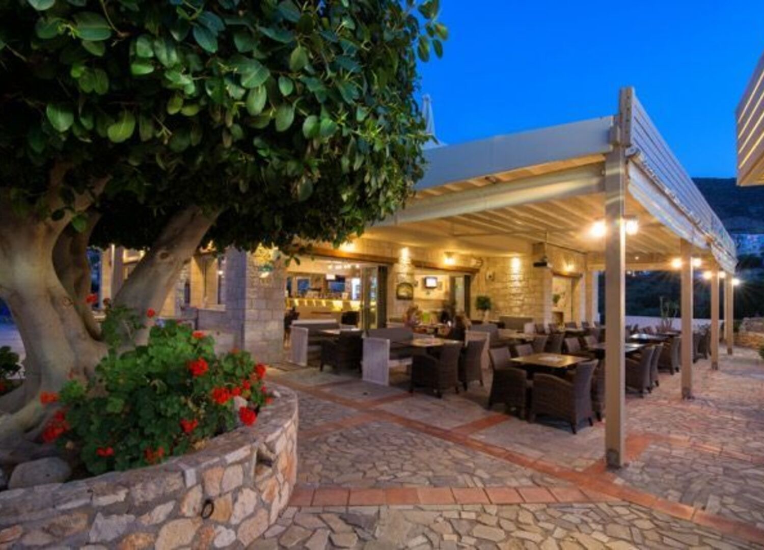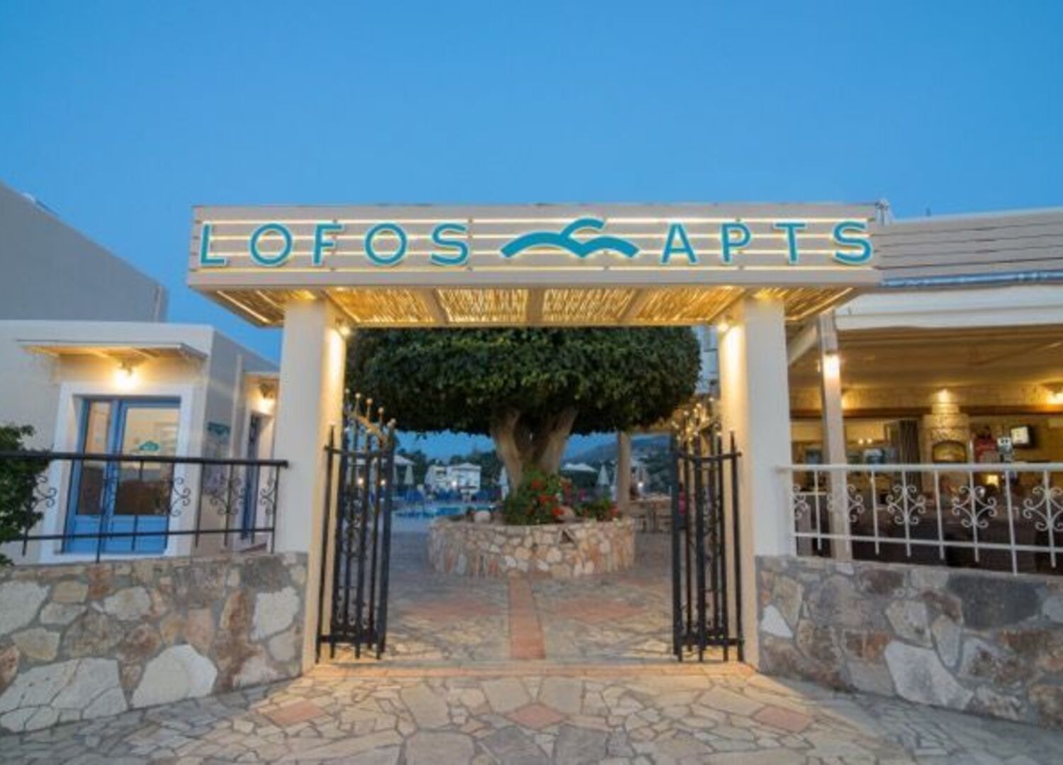Lofos hotel pool offers a large sun terrace where guests can relax and sunbathe. A children’s pool is also available. Next to the pool area, a bar restaurant serves drinks and cocktails, as well as lunch and dinner.