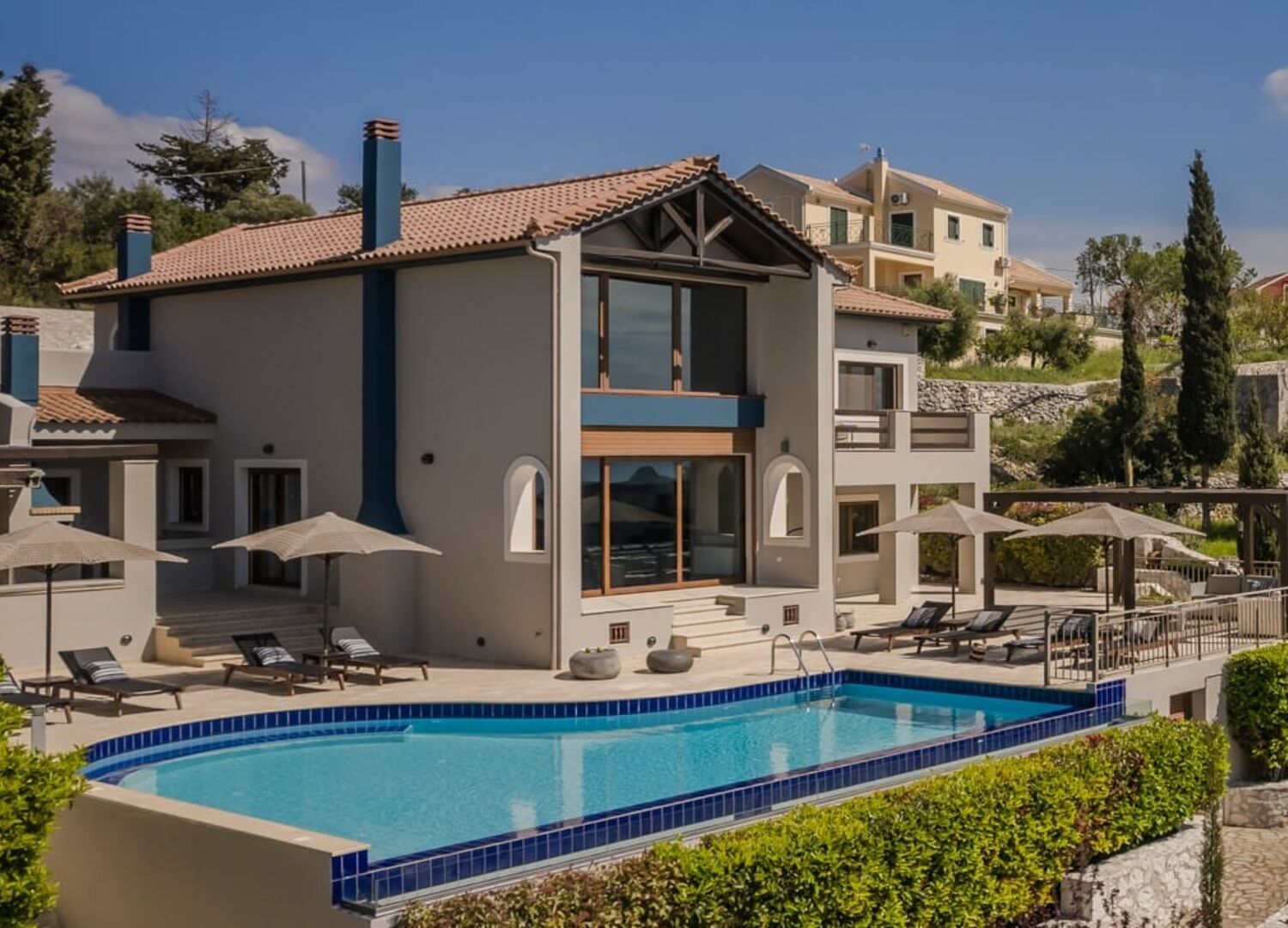 Designed to seamlessly blend mountain and summer vacation home aesthetics, Villa Karmaniolos maximizes its stunning setting. The villa features expansive full-height windows and large terraces, allowing guests to fully appreciate the surrounding natural beauty.