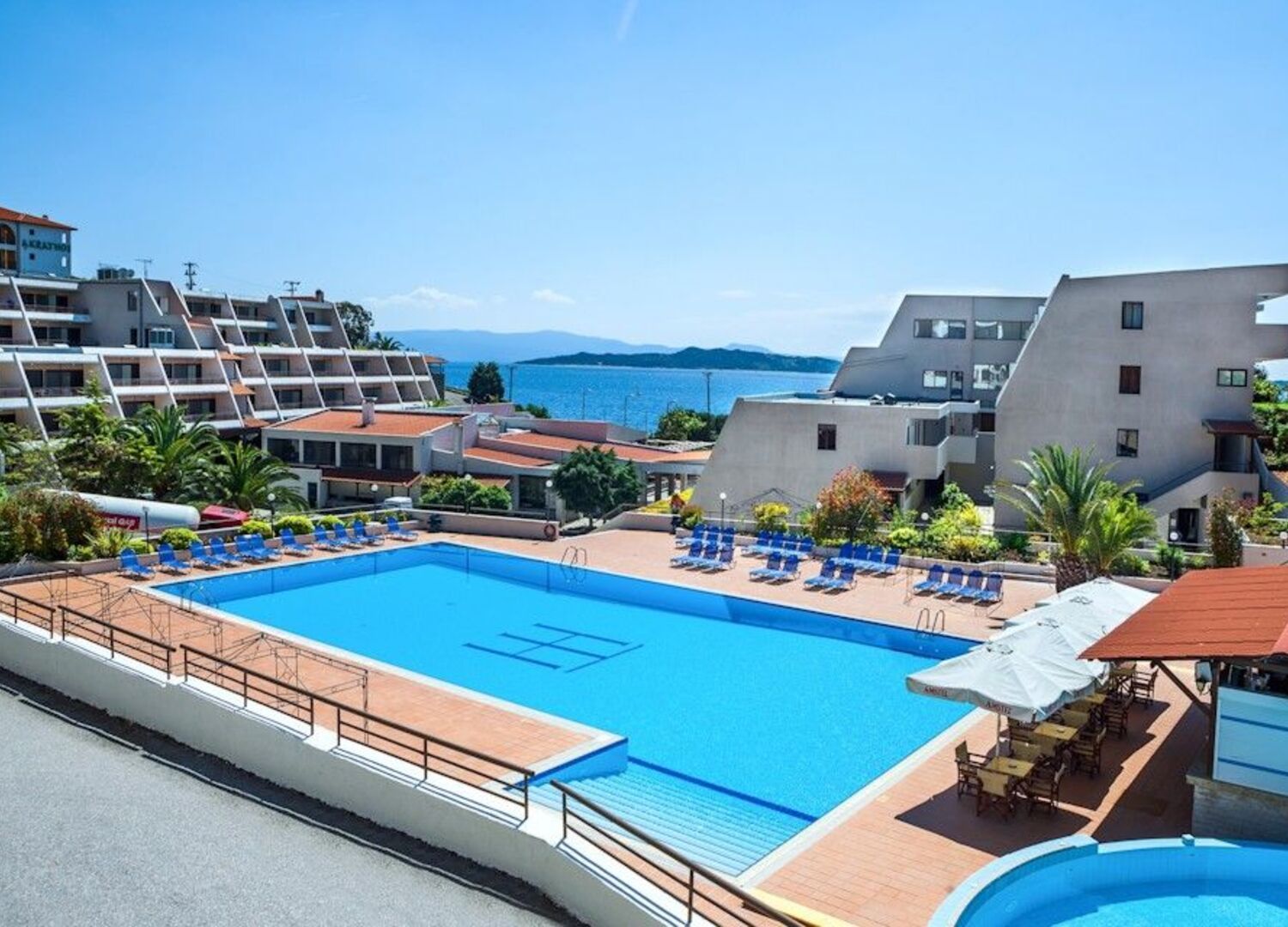 Xenios Theoxenia Hotel 4 Stars is  located in one of the most beautiful places of an important cultural hub of Orthodoxy . The hotel respects the monastic architecture, was built like a sister hotel of the Metropolitan Hotel in Thessaloniki.  The hotel complex Xenios Theoxenia is situated in three kilometres from Ouranoupoli, Halkidiki the peninsula of Mount Athos, near the Holy Mountain in front of the blue Aegean.