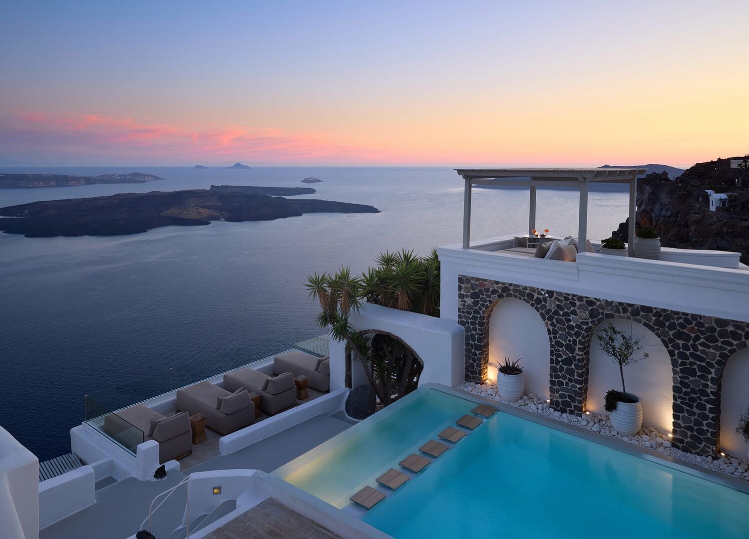 Iconic Santorini is a luxurious 5-star boutique cave hotel located in Santorini's volcanic caldera wall in Imerovigli. Offering breathtaking views, chic accommodations, delicious local cuisine, luxury amenities, and authentic Greek hospitality, this hotel provides a haven of tranquility and romance for guests. Families with children are advised to seek other accommodations.