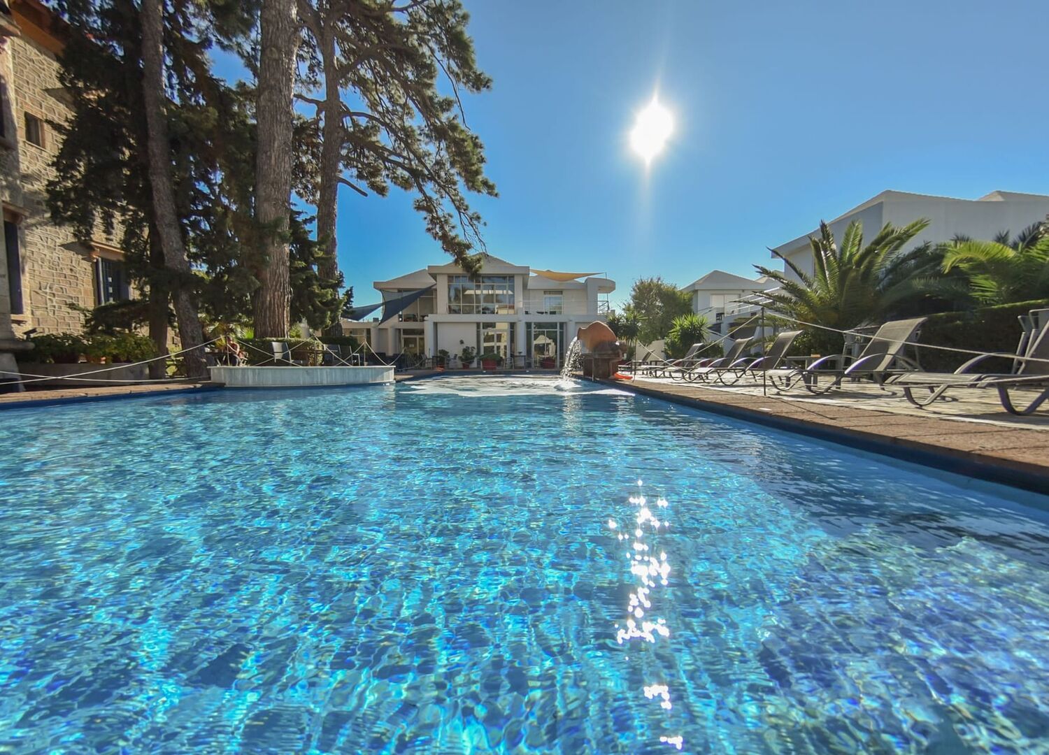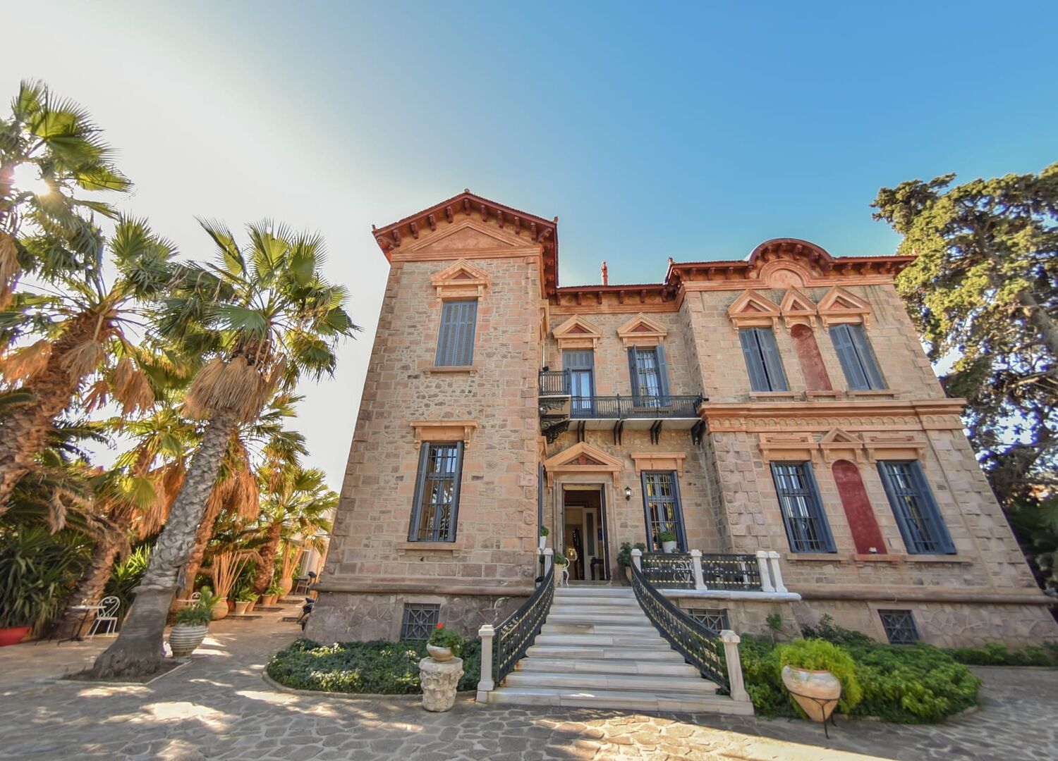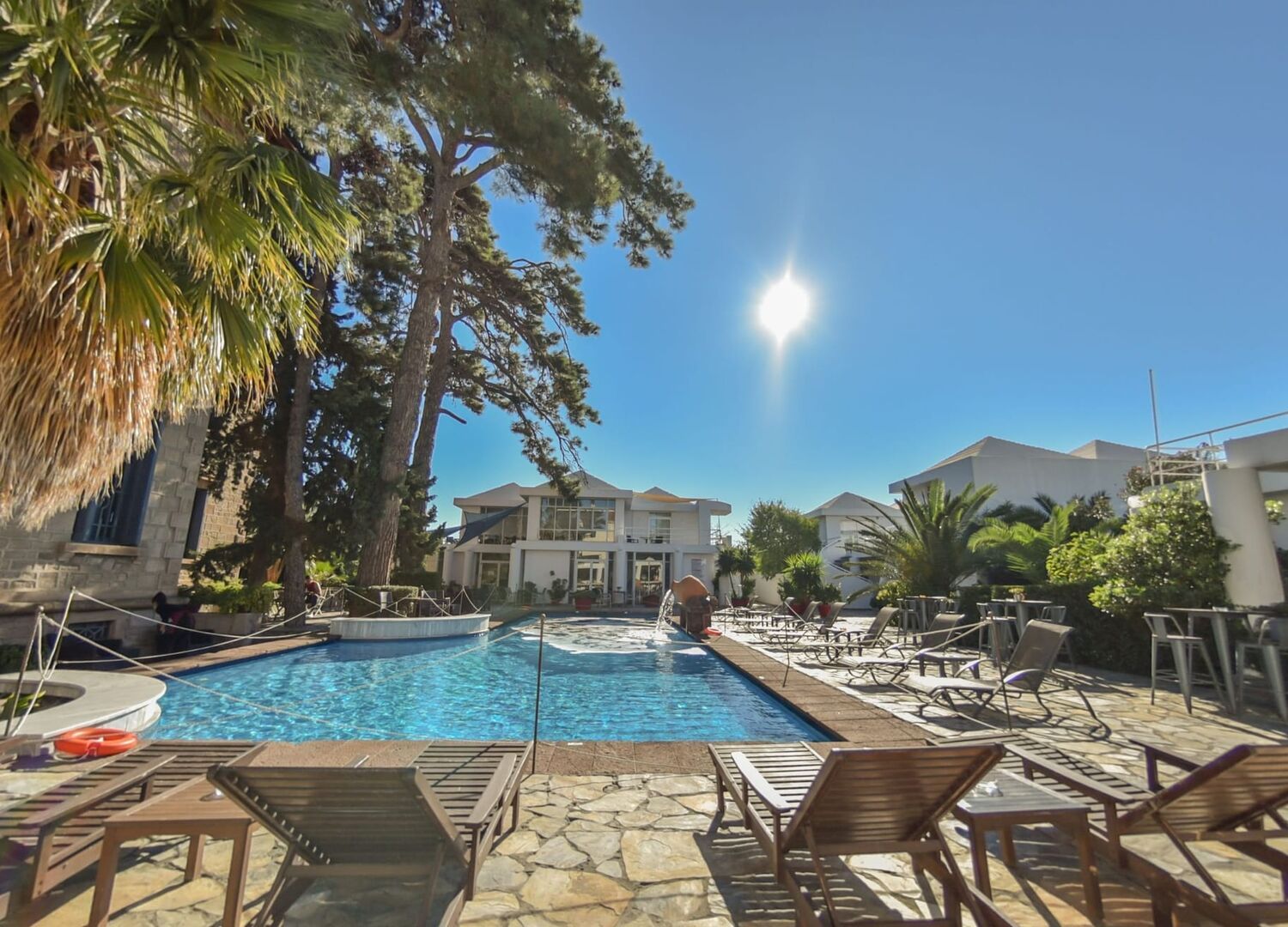 In the vast grounds there is also our modern complex which includes Studios and Modern suites, surrounded by many beautiful fully developed trees. A feature of our garden is the century old Oleander and Laurel Avenue once used by the Mansion’s horse and carriage, connecting the main house and the stables at the rear. The sea water, in our in ground swimming pool, partly shaded by giant pine trees, is another feature of our estate.