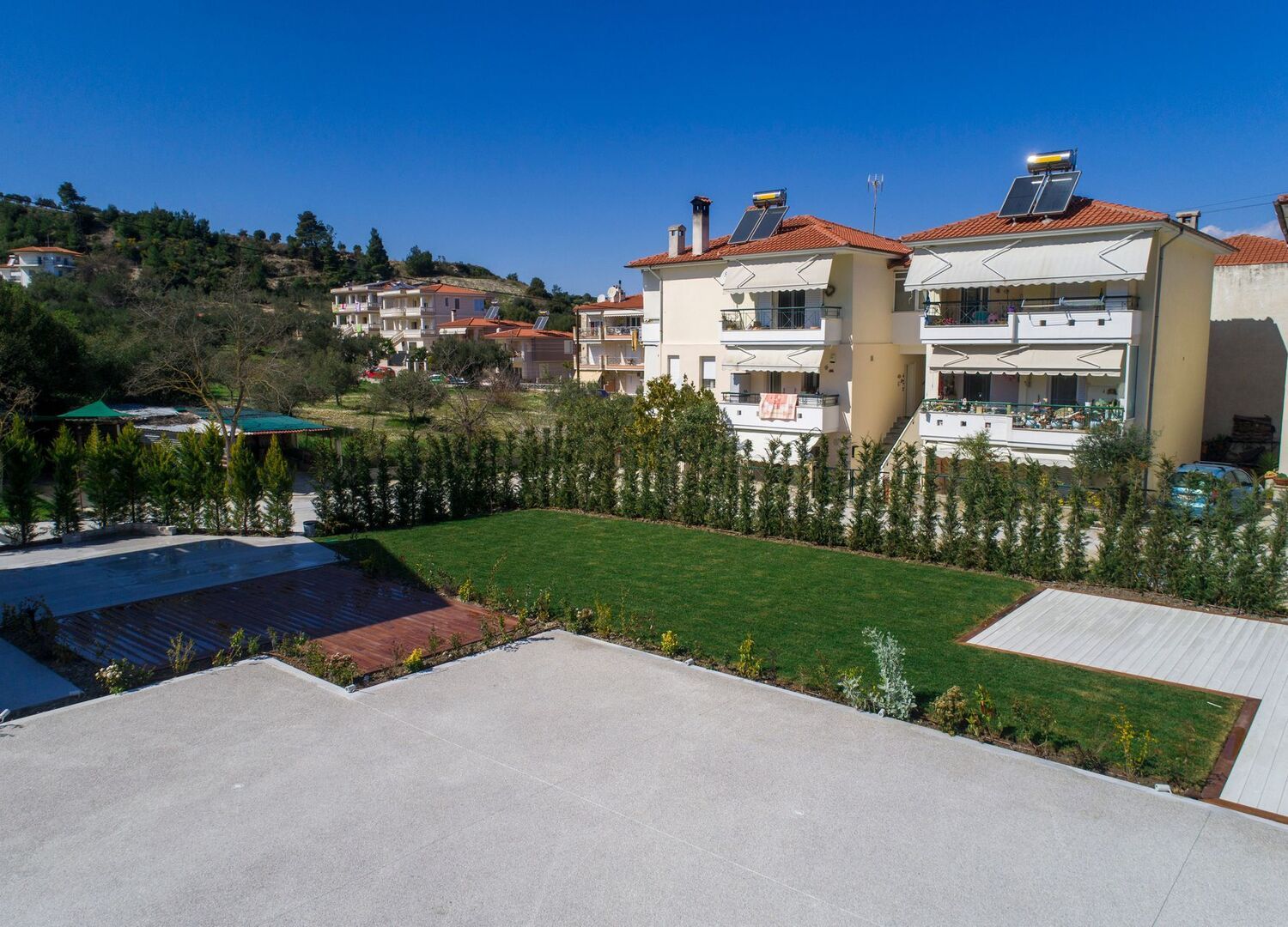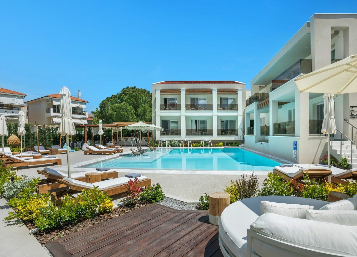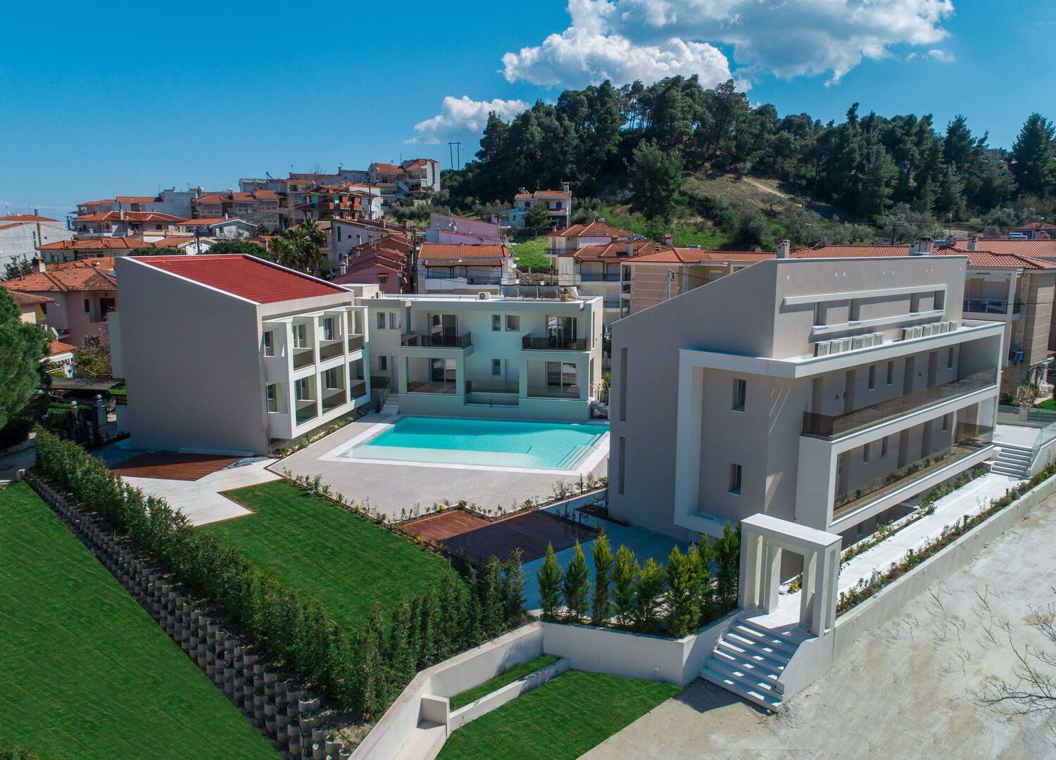 Mirablue residences is a brand new small apartment complex (Opening 2020) which combines luxury and comfort. It has outside swimming pool with public space, gym facilities, massage room and offers full buffet breakfast. Located in the Pefkochori village, 96 km from Thessaloniki airport (1h 15m drive). Only 500m from the Pefkochori beach and only 5km from the emerald Glarokavos beach as well as very close to many other fabulous beaches. Natural hot springs Loutra Agias Paraskevis is 10km away.