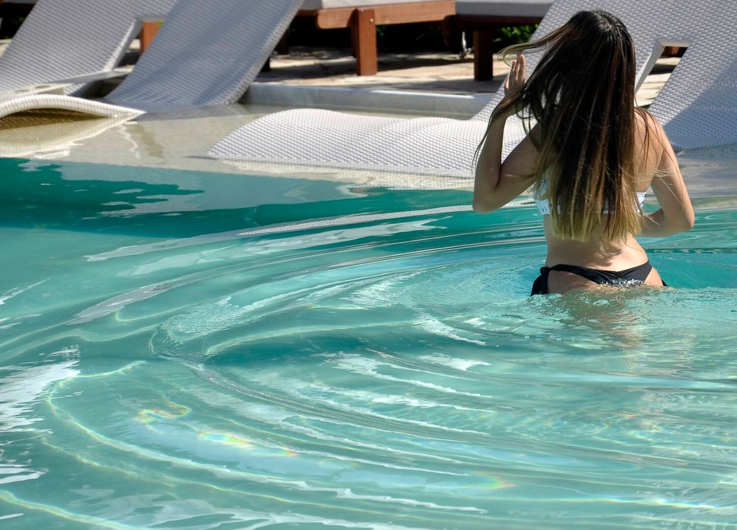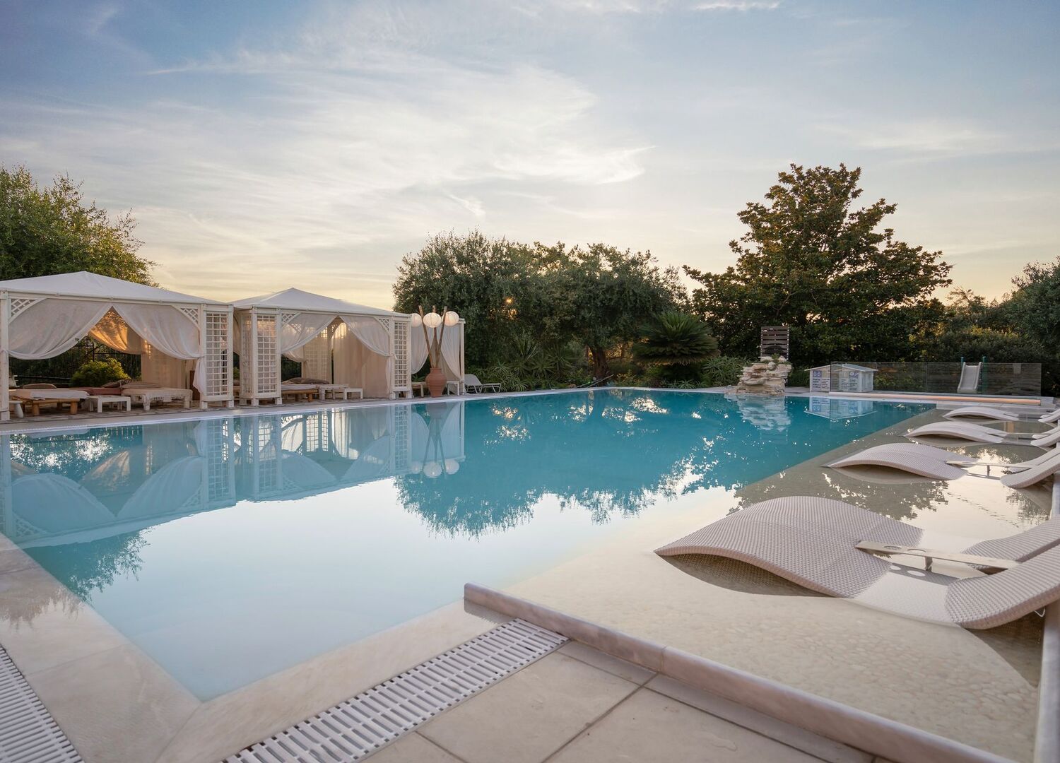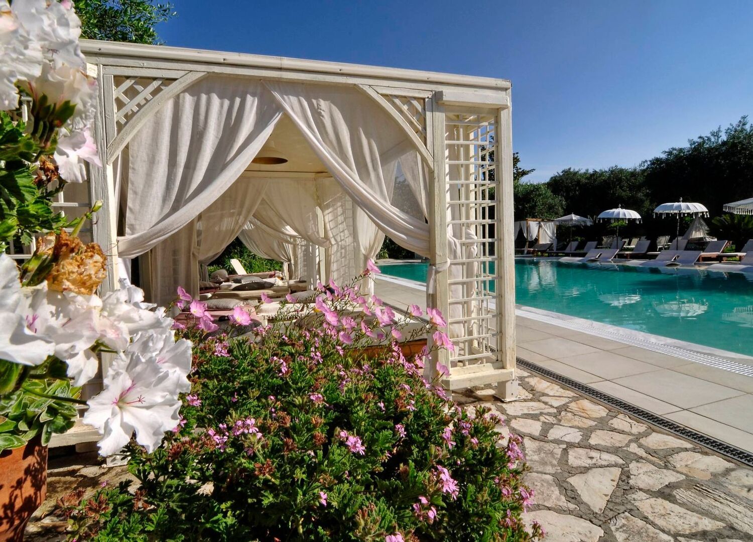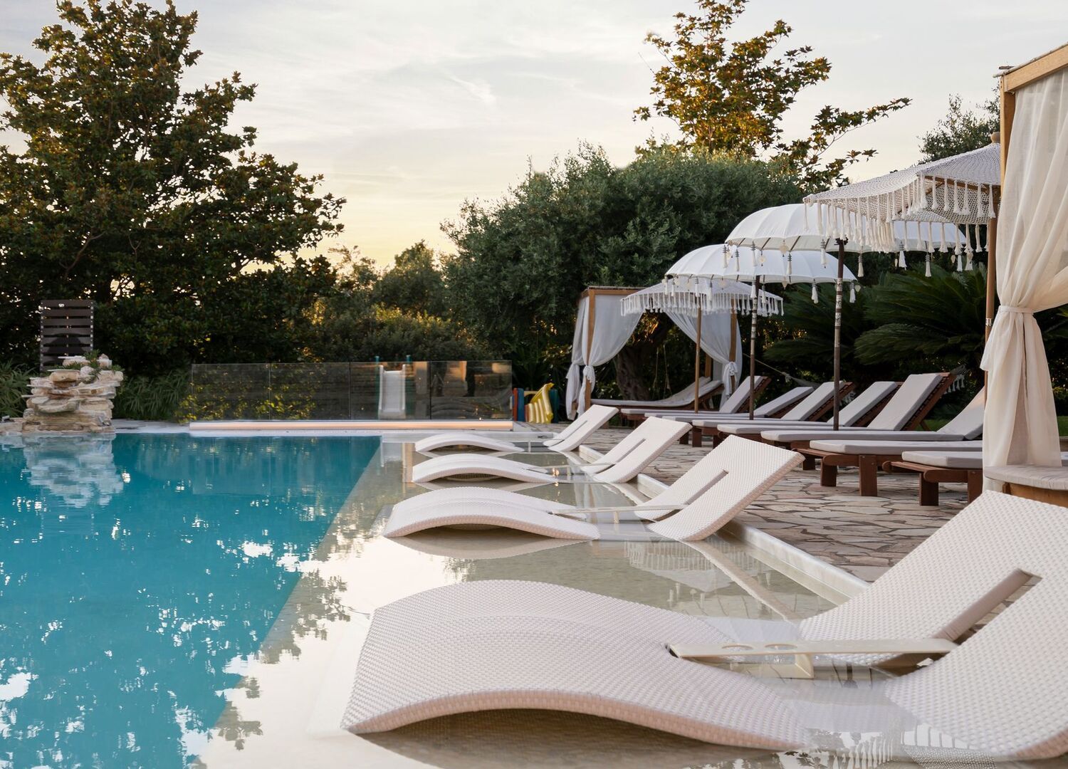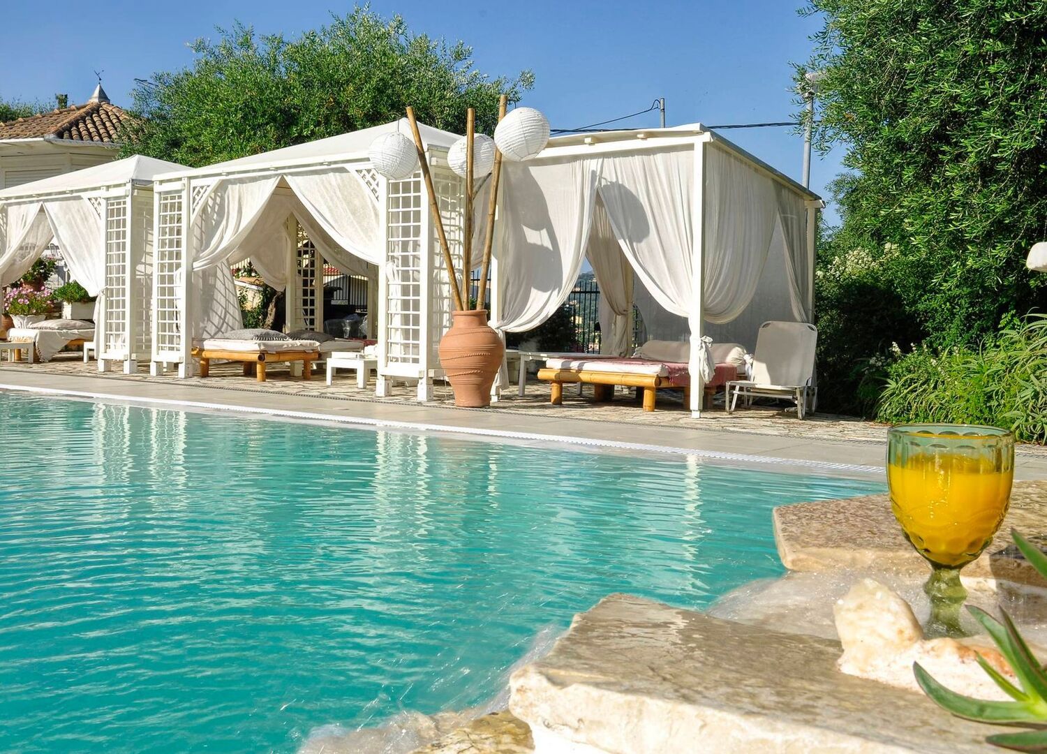 Nefeli Hotel has an outdoor pool with sun loungers and daybeds, surrounded by olive trees & tropical plants, and a pool bar where you can enjoy coffee, ice cream, and refreshing cocktails in the shade of large pergolas.