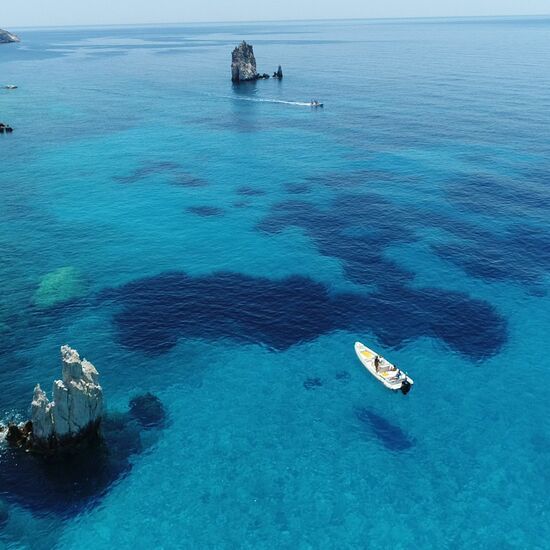 Partiendo del muelle de Platis Gialos, en el sur de Sifnos, nos dirigimos hacia el suroeste y, tras 8 millas náuticas, alcanzamos la isla deshabitada de Poliegos. Si el tiempo lo permite, nos detendremos en la Cueva de Fanara, con sus aguas azules y cristalinas y los bellos colores de sus paredes de roca volcánica.