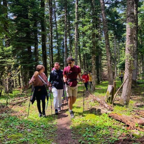 - Comience su aventura en Neochori, recorriendo vibrantes bosques de robles y abetos. A medida que ascienda, encontrará diversas especies arbóreas como castaños y nogales a menor altitud, y enebros enanos a mayor altitud.