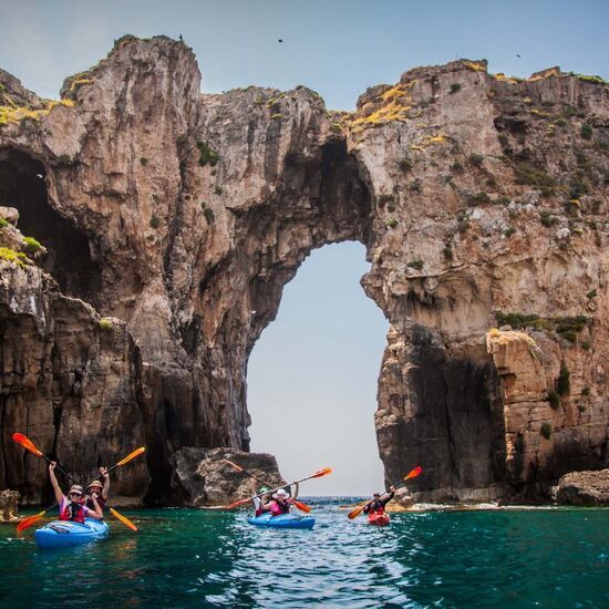 Nuestra excursión comienza en la playa de Divari, a pocos kilómetros del encantador pueblo de Gialova. Su guía le informará sobre las técnicas de remo, las medidas de seguridad y el equipo. Enseguida nos subiremos a nuestros kayaks para recorrer la bahía de Navarino como nunca antes. Comenzaremos remando con vistas a la ciudad de Pilos y al fuerte de Niokastro. Dirigiéndonos hacia el imponente islote monolítico situado en el lado sur de la bahía, visitaremos el impresionante arco de piedra natural. El islote es también un lugar de anidamiento y descanso para muchas especies de aves. Si el tiempo lo permite, podemos circunnavegarlo y visitar algunas de sus cuevas marinas, túneles y arcos. Nuestra siguiente parada es la isla deshabitada de Sphacteria. Aquí, saltaremos de nuestros kayaks, estiraremos las piernas y caminaremos hasta el mirador de la isla para tomar fotos de un paisaje idílico y para contar historias. Después de navegar en kayak, haremos una parada en una playa aislada para nadar y bucear con tubo y, por qué no, bucear en un acantilado para los que se sientan más aventureros. Aquí también degustaremos nuestro picnic casero de delicias locales y nos relajaremos bajo el sol. Después de esta parada llena de energía, remaremos de vuelta al punto de partida para terminar un día increíble en la tranquilidad de la bahía de Navarino.