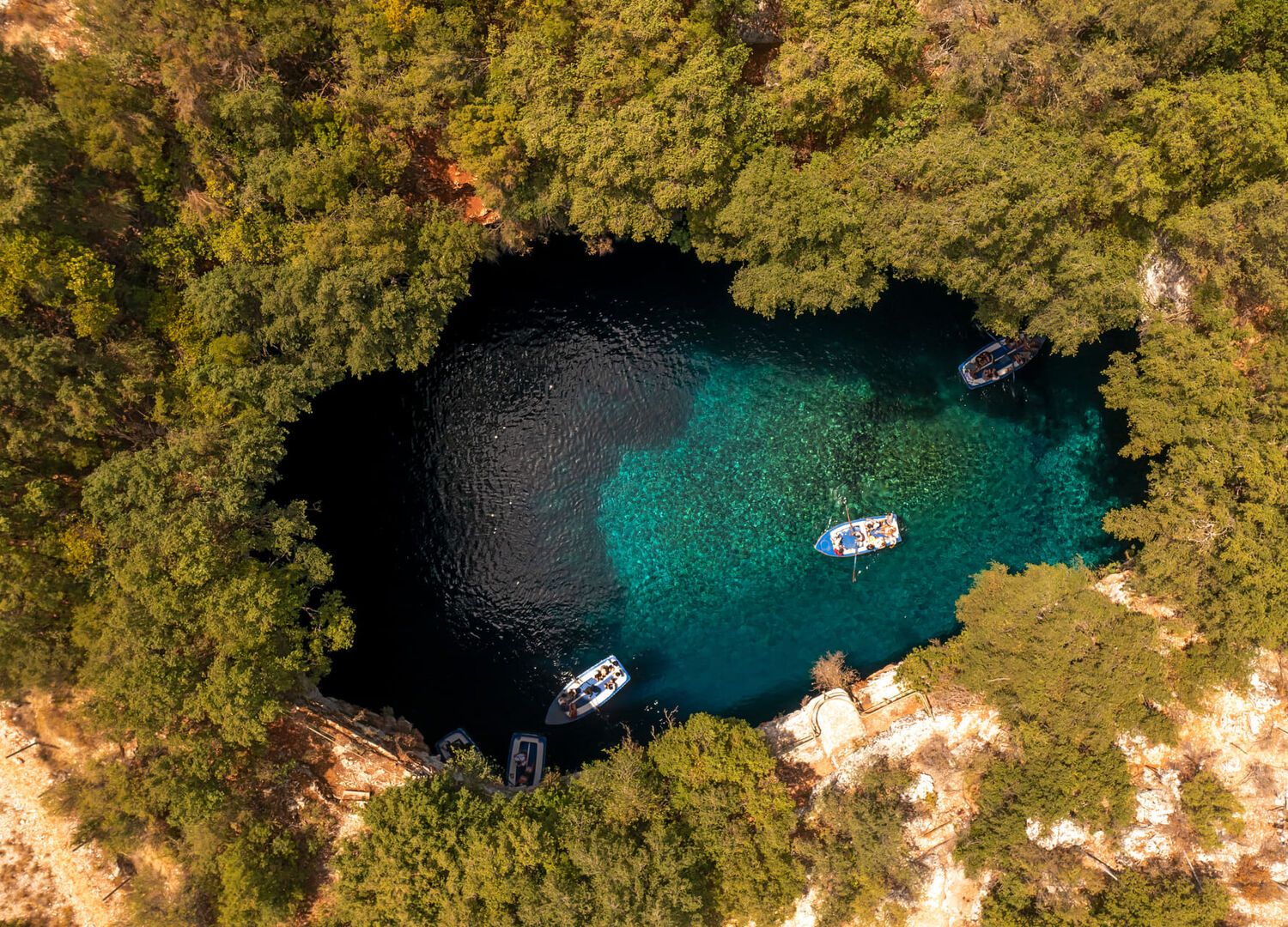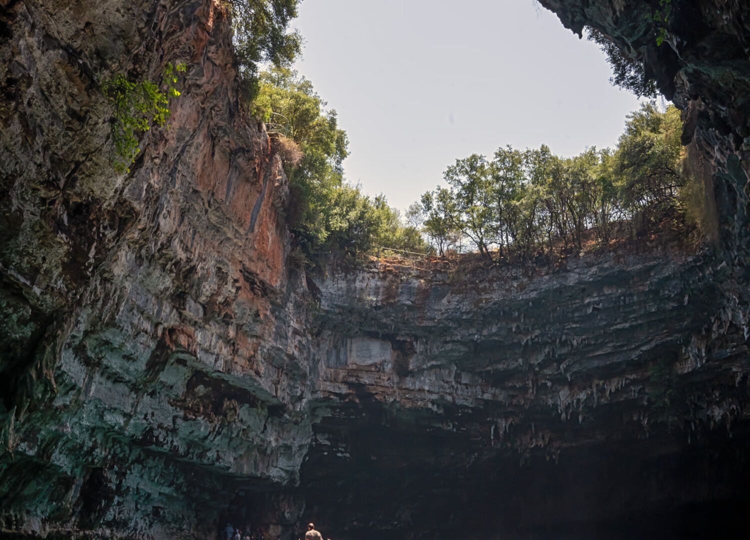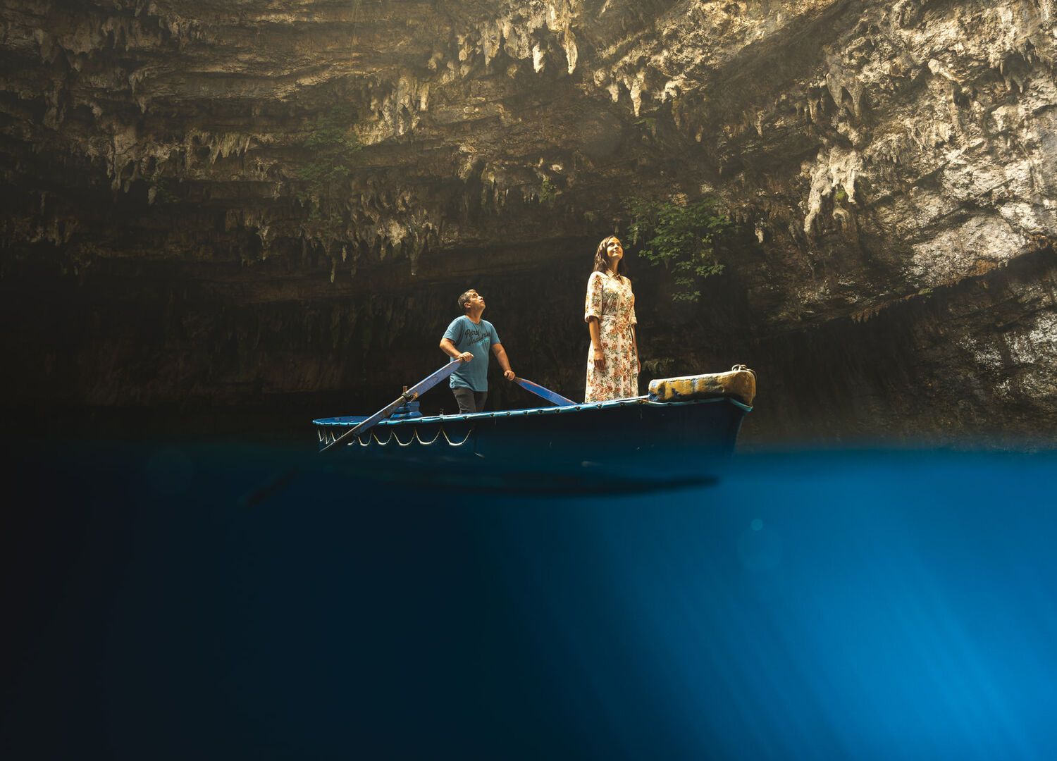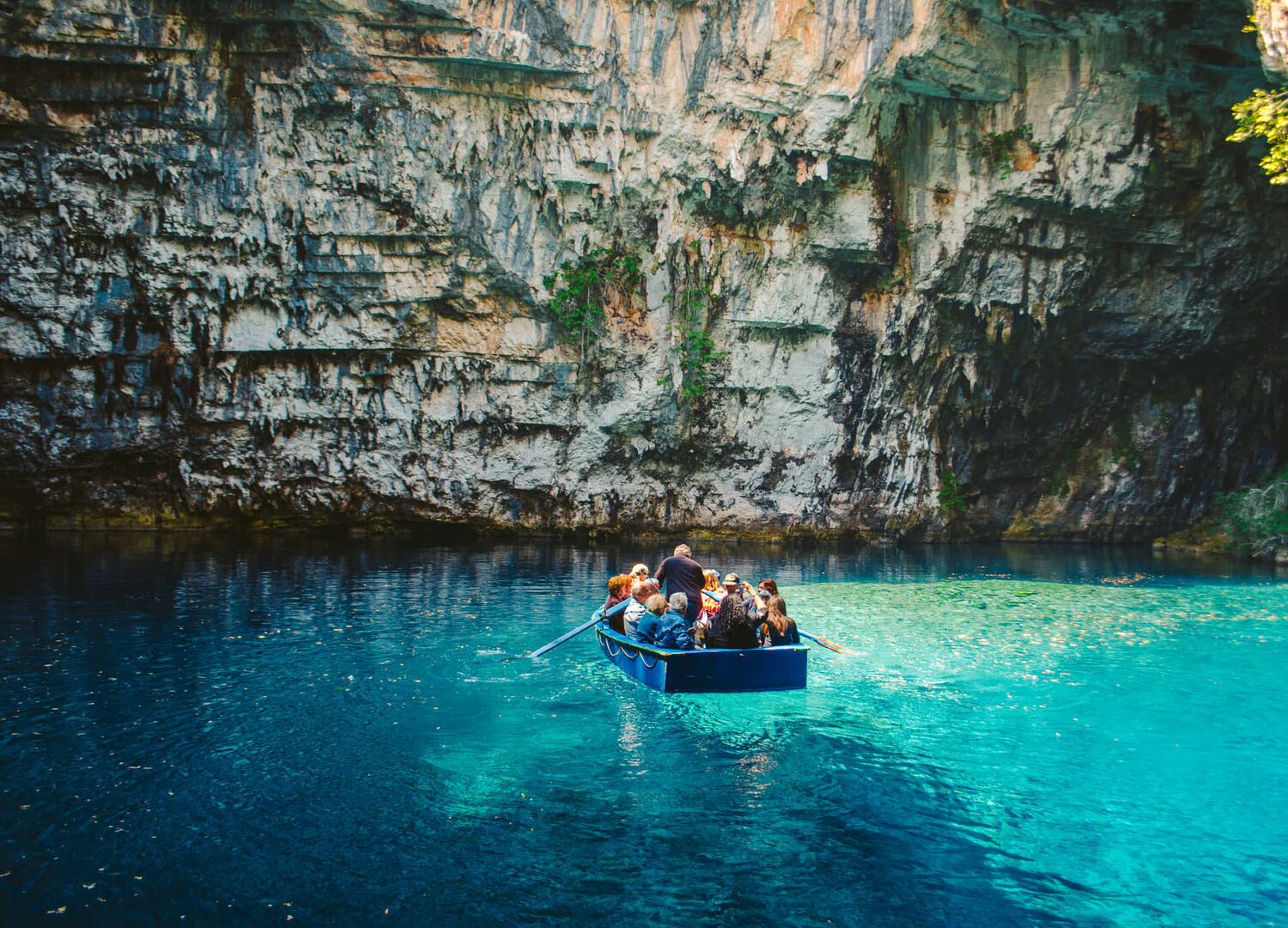 Un paseo en barca por la cueva de Melissani consiste en que un barquero te reme alrededor del lago y te cuente la historia geológica de la cueva. Hay una gran cámara al aire libre (el techo se derrumbó hace siglos) y una sección cerrada con estalagmitas y estalactitas de 20.000 años de antigüedad y un yacimiento donde se han encontrado antiguos artefactos humanos.
