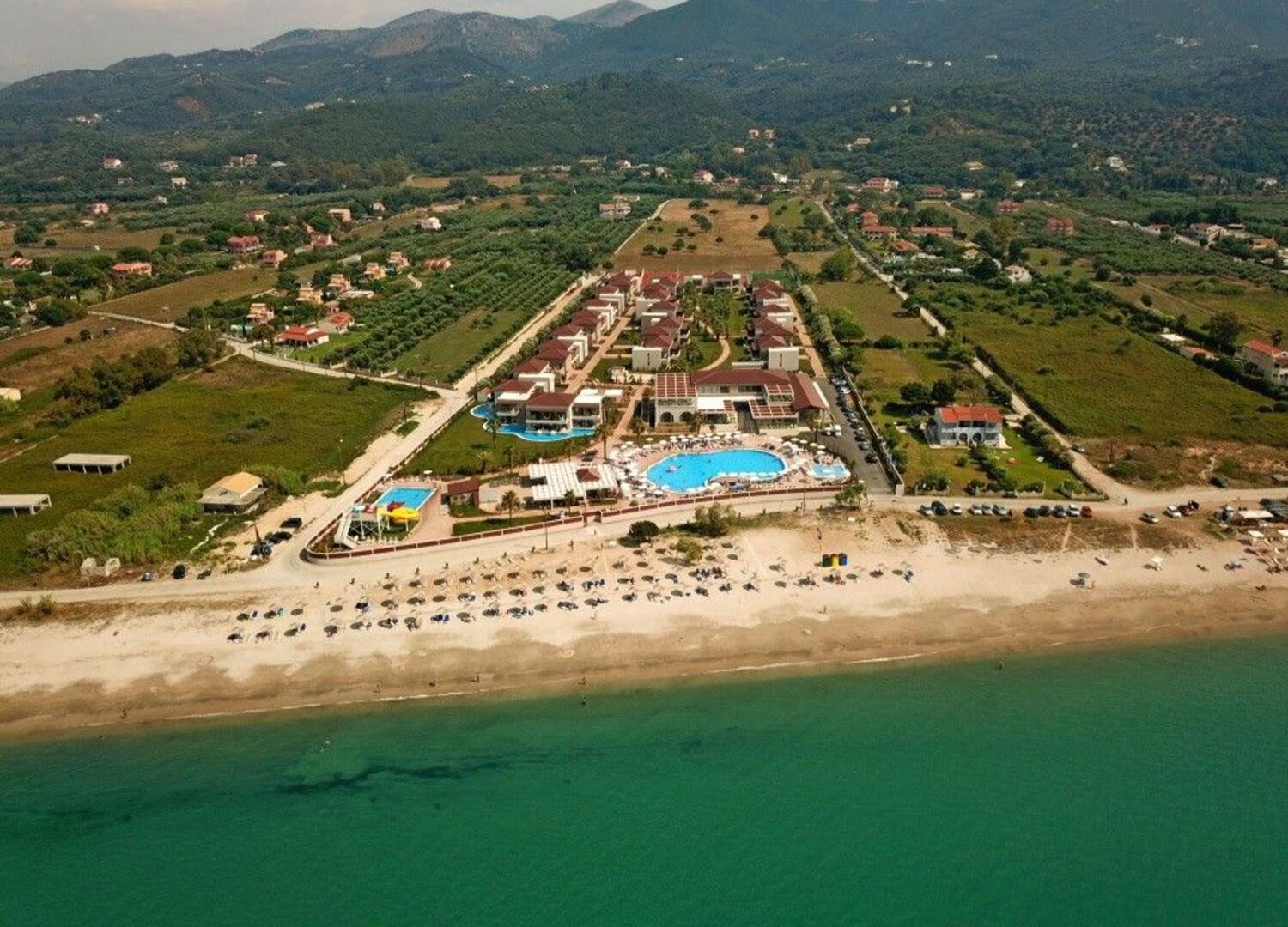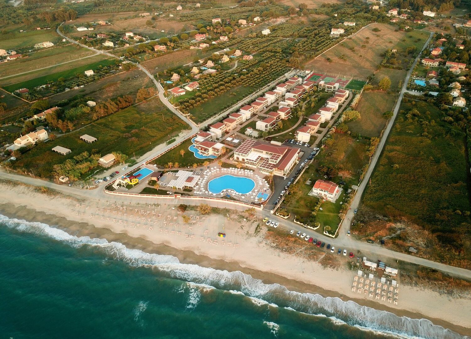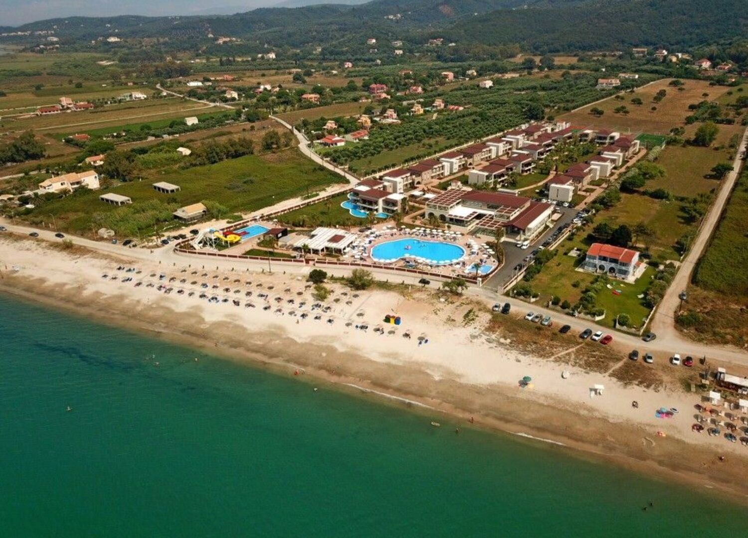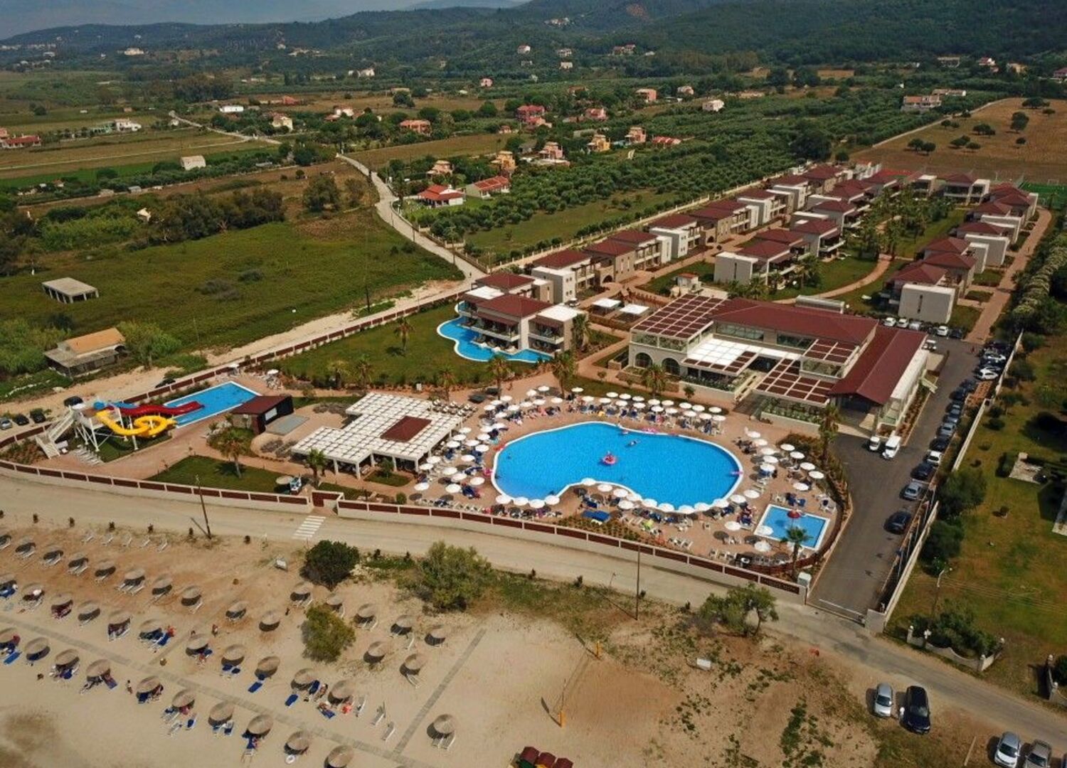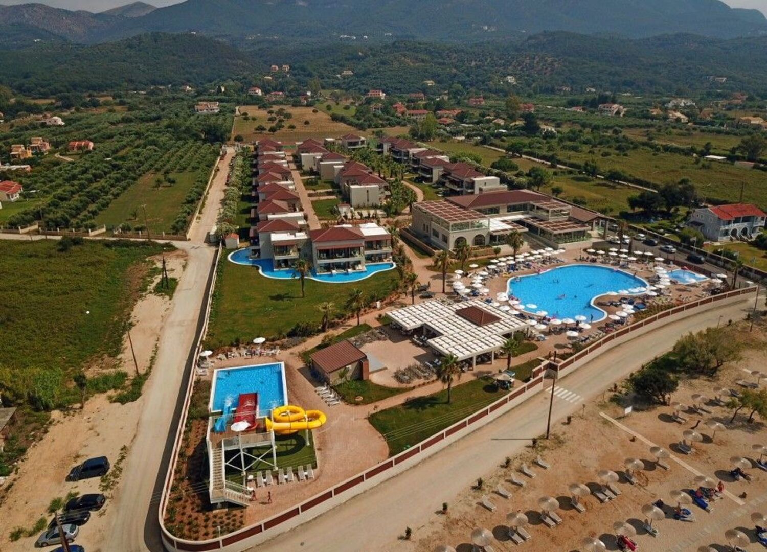 Almyros Beach resort & Spa its a newly build(2019) beach front, 5* hotel which includes 180 rooms spreaded in 12 buildings named after the 12 Greek Gods. It is a contemporary Family friendly hotel providing BB, HB and All Inclusive mealboards, builded in a unique location in front of Almyros sandy beach on the north coast with the most amazing sunset in Corfu island. Its Located 42 klms from Kapodistrias International airport and only 2 klms from Acharavi, a town where you may found shops, bars, restaurants & Supermarkets. In the main building, on the ground floor is our Reception and Lobby area with the Lobby Bar and main restaurant that Breakfast, lunch & dinner will be served. In the -1 floor you will find our Spa & Fitness facilties in an area of 300 sqm's, 2 Kids miniclubs, 2 shops and a multifunction room equipped with Audiovisual equipment sufficient to host special events like weddings, business meetings, for up to 100 people. Dine in our Roof top Ambrosia Ala carte Restaurant or enjoy the sunset with your favorite cocktail in our Nectar Roof top bar . Relax on the Pool area and enjoy your swim in the 600 sqm's swimming pool while having your favorite dring from the pool bar. 3 water slides, a childrens Pool and a playground is availiable for our little friends and our Animantion team will keep them entartained with several outooor and indoor activities to the Kids clubs. 2 Tennis courts, a 5x5 football and a basketball/volleyball courts are avaliable and a daily animation program with Yoga/Pilates/karaoke/ Dance cources will keep you entartained and fit