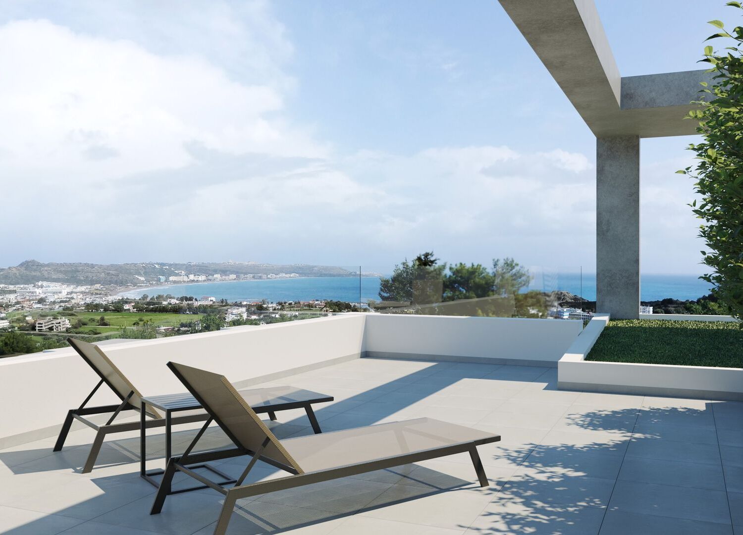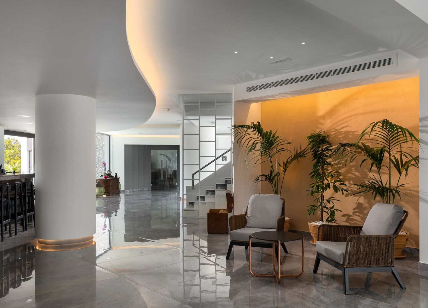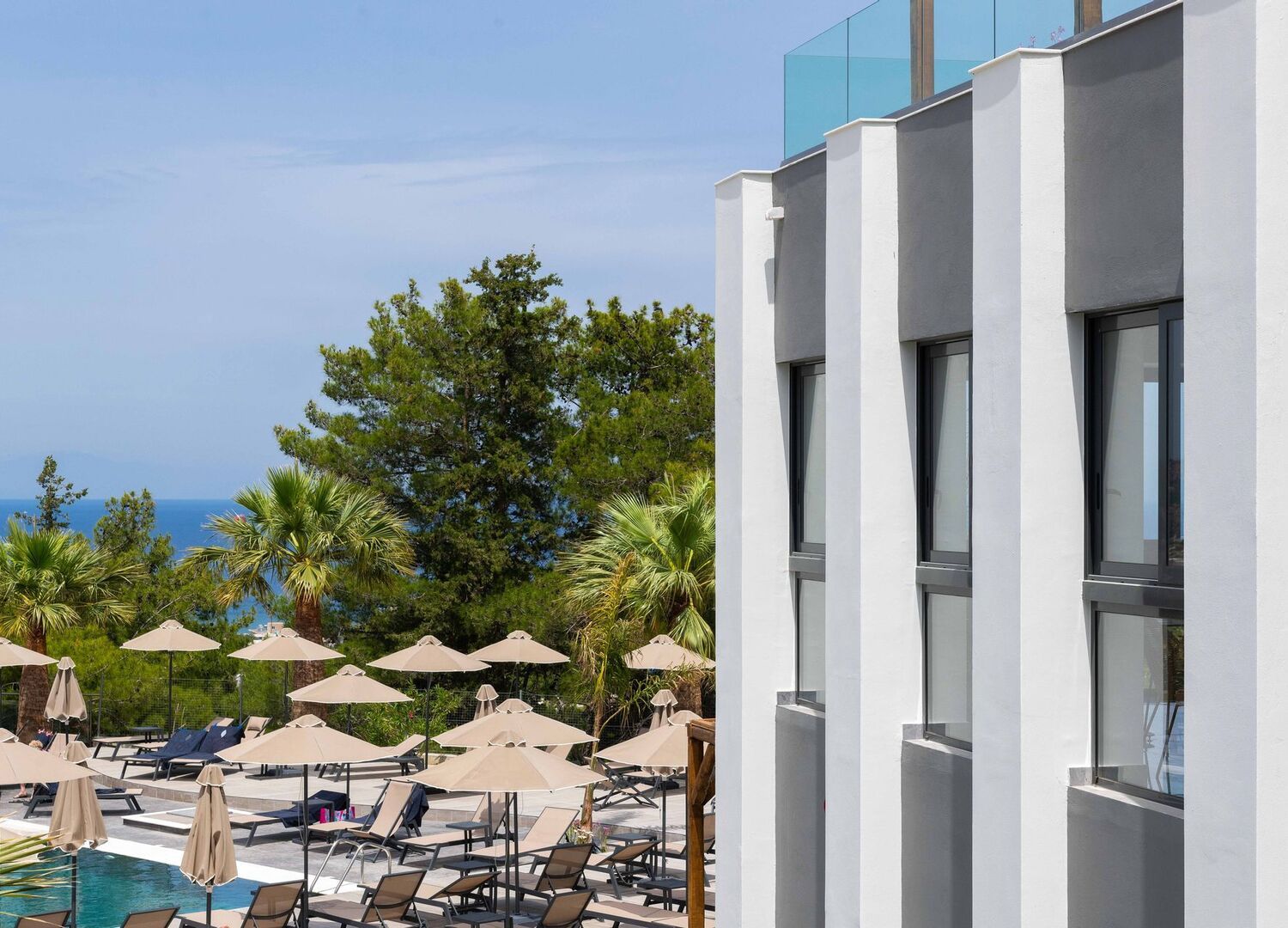 An adults only hotel with modern and greek ethnic design elements. The hotel is located on a forest covered hill overloking the Faliraki bay. It features a large infinity pool, two bars, a reaturant and a snack bar.