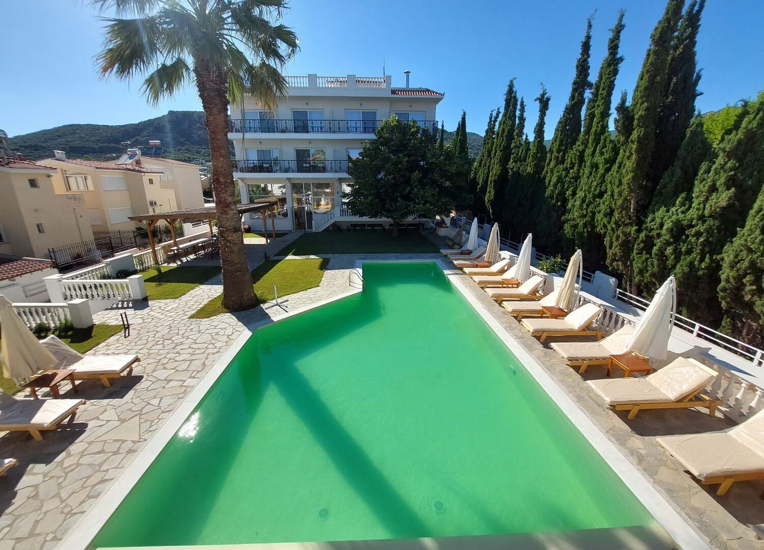 The hotel is a complex of three buildings with swimming pool and green garden with trees in between. You go out through the back door and you are already on the sandy beach. The staff and hotel manager were extraordinarily friendly and polite. The breakfast contained of everything you need, the diner was different every evening. One could order a drink from the bar and enjoy the delicious food in the restaurant, on the terrace or by the pool. For lunch you could order from a pretty rich menu, salads, fish, pasta, pizza. Our staying at the hotel was a pleasure, highly recommend.