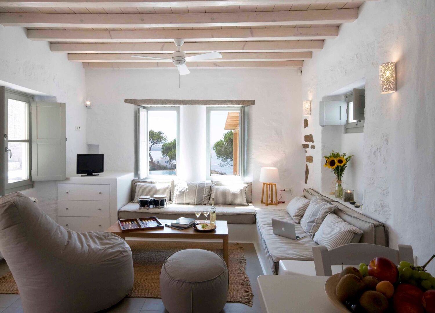 It consists of three accommodations: a Traditional House for up to 6 guests, a Suite for 2 guests (an adjoining door gives the possibility of renting these two accommodations as a whole for 8 guests) and a Honeymoon House for 2 guests. Larger groups of up to 10 guests can rent the whole place as one and enjoy privacy and exclusivity, of what we call the Cloud Blue Villa.