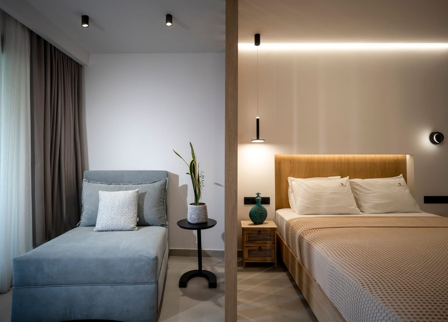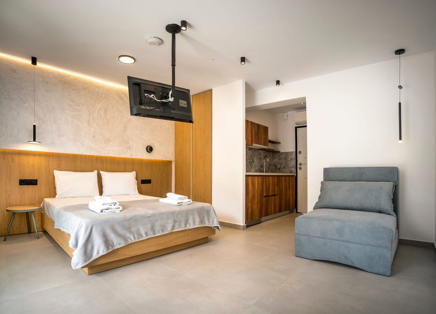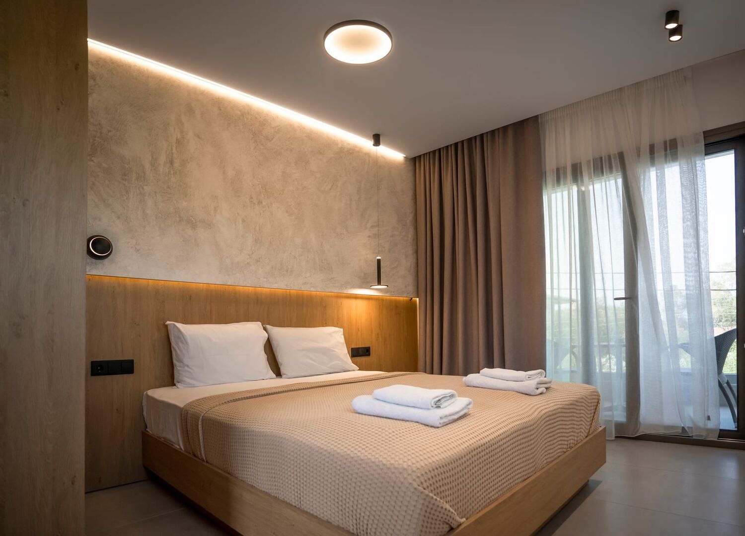 Close to the beach and 2km away from the restaurants. Half of the resort is renovated in 2024 very nicely, you have all the facilities needed and breakfast option. Close to all main beaches (max 20 min by car) Very good price comparing with the rest of the hotel in the area . The Olives garden is very nice and the host is responding promptly to all your requests.