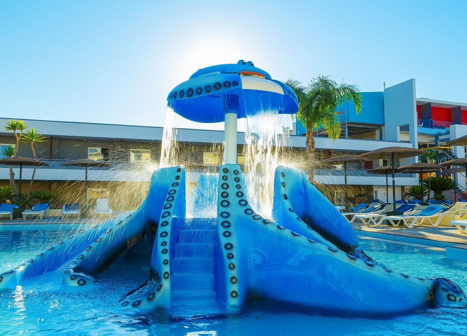 Suitable for couples and specializes in family holidays, has 2 outdoor swimming pools for adults, an outdoor swimming pool for children, 3 waterslides, a spa- wellness center and a gym.