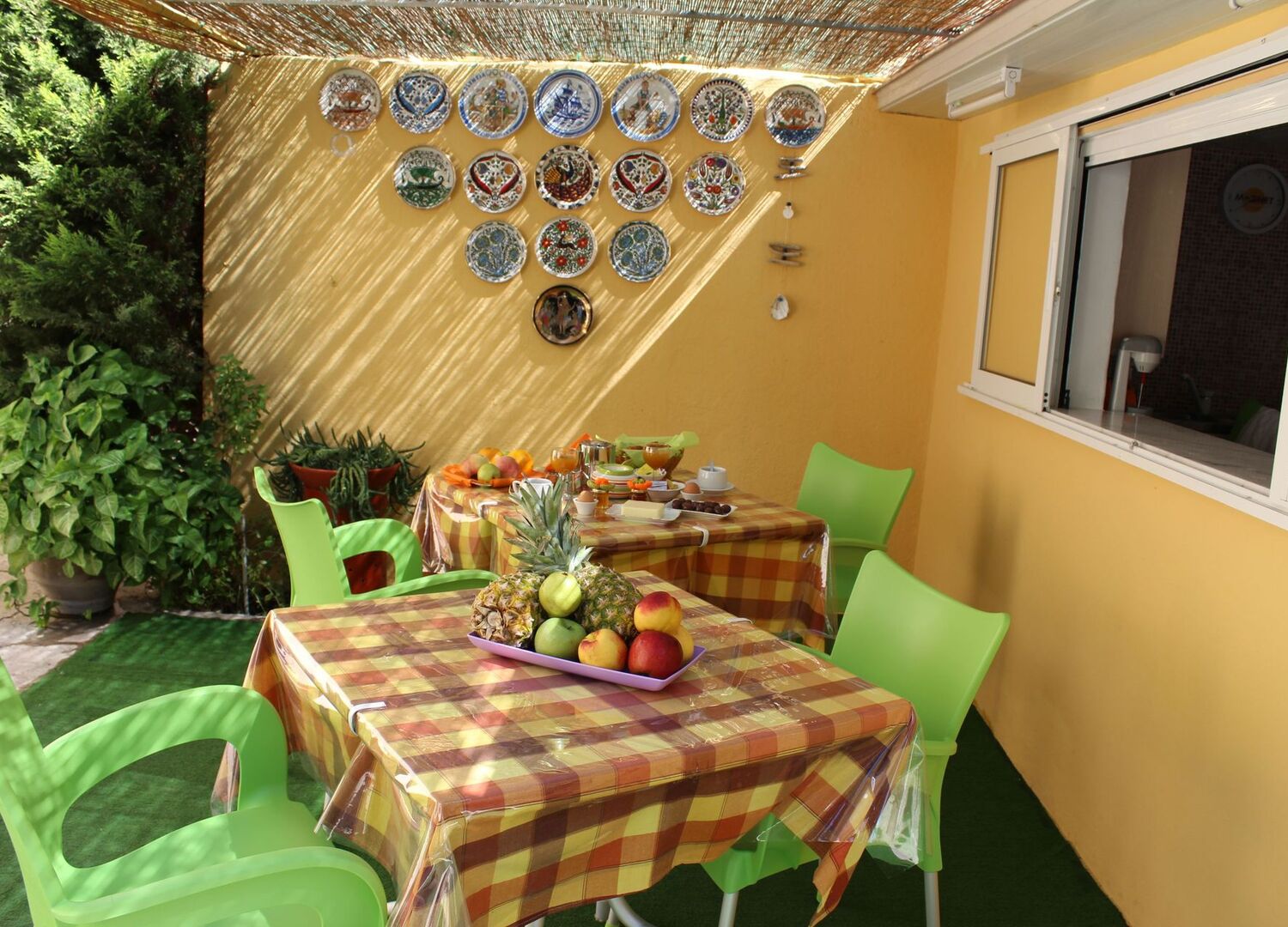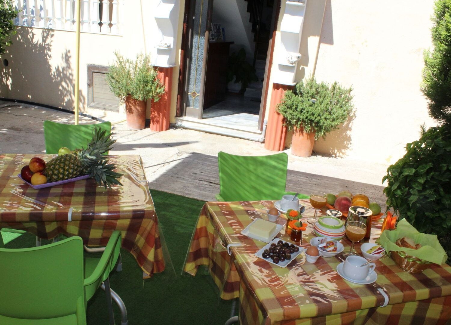Guests can borrow books from the hotel's library and enjoy reading in the sunny courtyard.