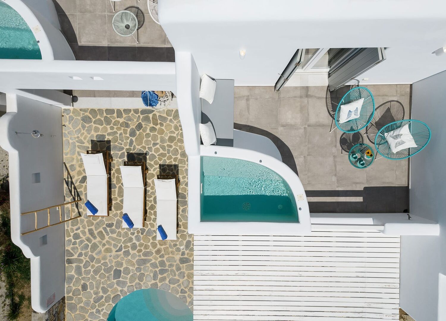 Upon your arrival, you’ll find your private and main entrance located at the back of the property, along with your own parking space. Entering the villa, you step into a welcoming area where, on the right, there is a fully equipped kitchen in shades of white and yellow. It includes all the necessary electrical appliances you may need during your stay (such as a stove, coffee maker, microwave, and washing machine), as well as complete kitchenware. To the left, you’ll find the ground floor WC, and straight ahead, the cozy living room awaits you, beautifully decorated in white and blue Cycladic tones that will instantly charm you. From the living room, a large balcony door leads to the outdoor pool area, offering wonderful sea views. Ascending the internal staircase to the first floor, you’ll find one bedroom with a double bed, where you can enjoy breathtaking sunsets over the Aegean Sea from your private hot tub. On the same floor, there is a second bedroom with two single beds and mountain views, as well as the villa’s main bathroom.