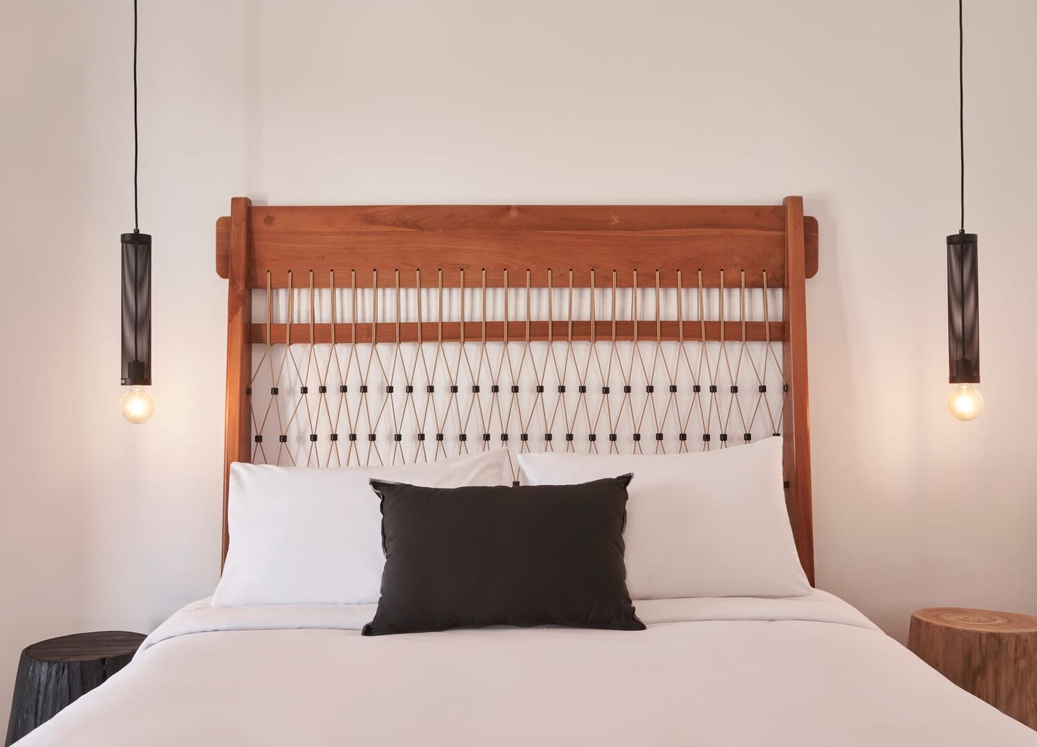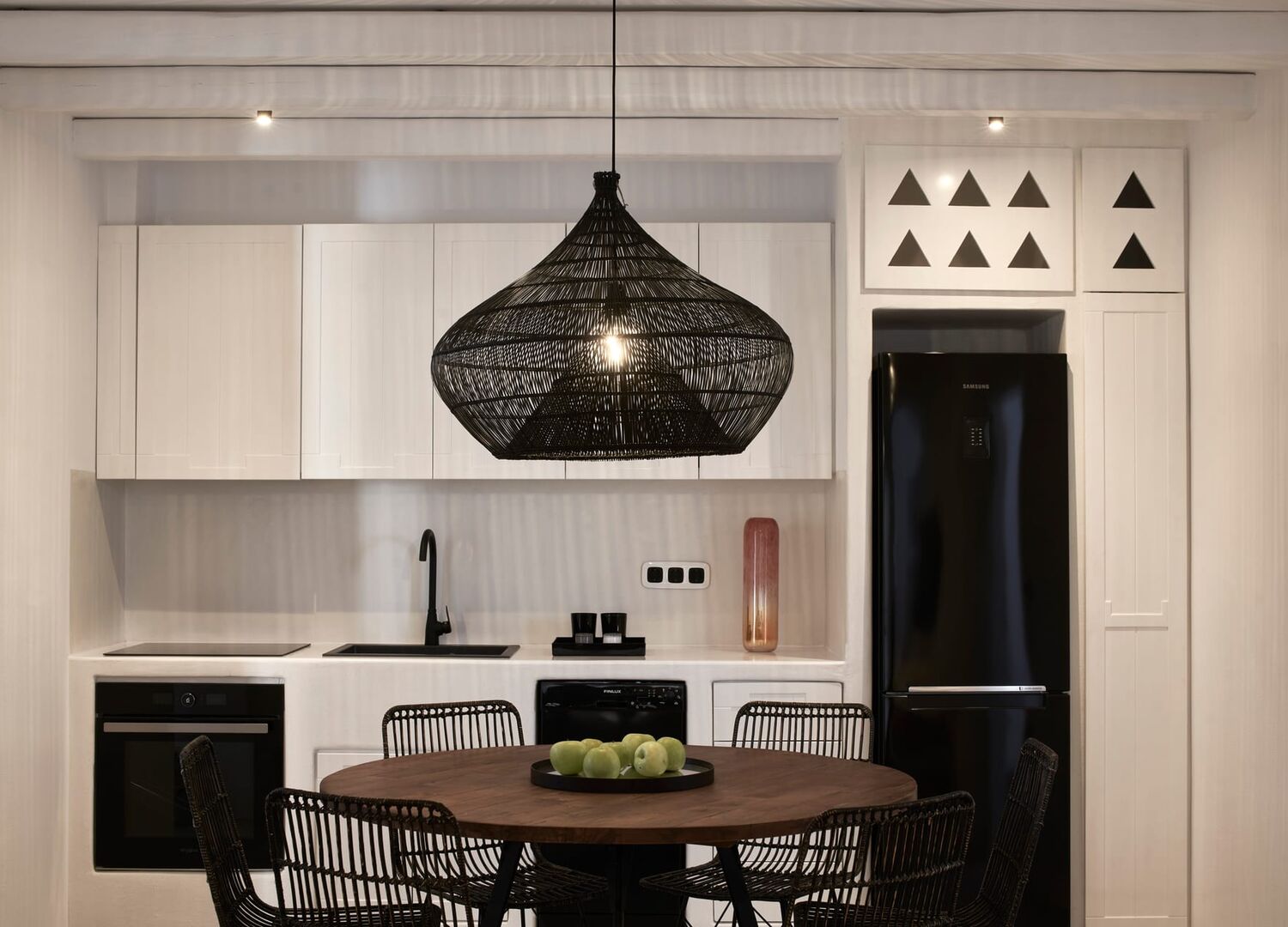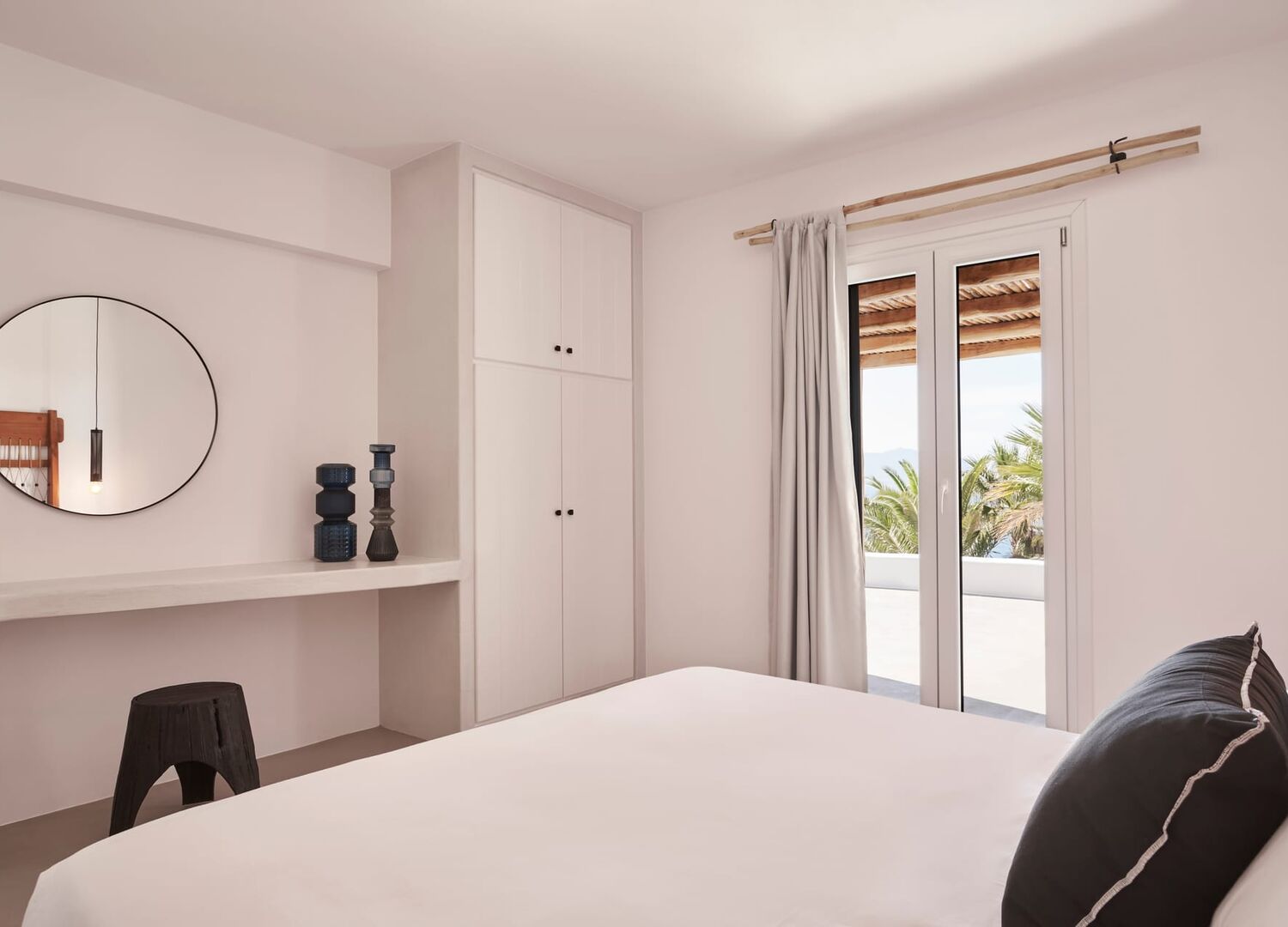 Minimalism and gentle simplicity in a playful dialogue with textures: stone, polished cement, wood, straw-plaited surfaces and built-in details, create the Hill Club Naxos serene ambience that integrates the light-filled interiors with the exterior spaces of the villas.