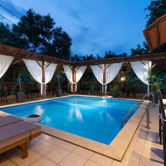 Kipos Resort is a charming hotel located in the seaside village of Nea Peramos. The hotel offers spacious accommodations with handmade iron beds, a swimming pool, pool bar, and free Wi-Fi throughout. Guests can enjoy a daily breakfast in their rooms and relax by the pool with a drink from the bar. The hotel is conveniently located near the center of Nea Peramos and is a short distance from the city of Kavala and Kavala International Airport.