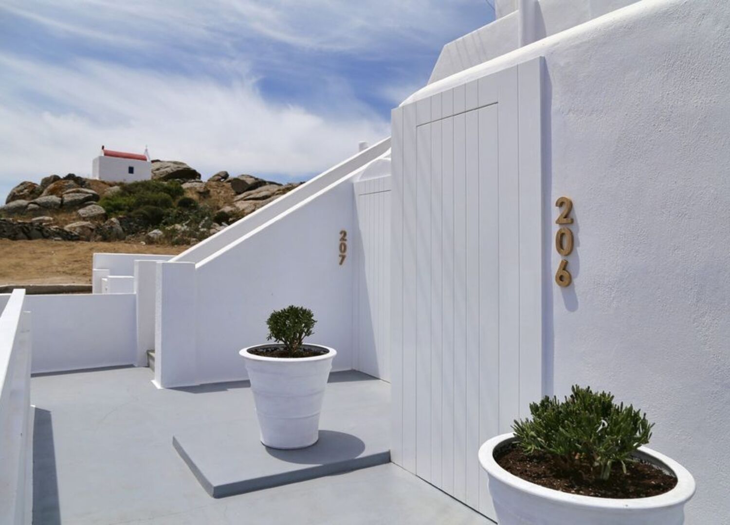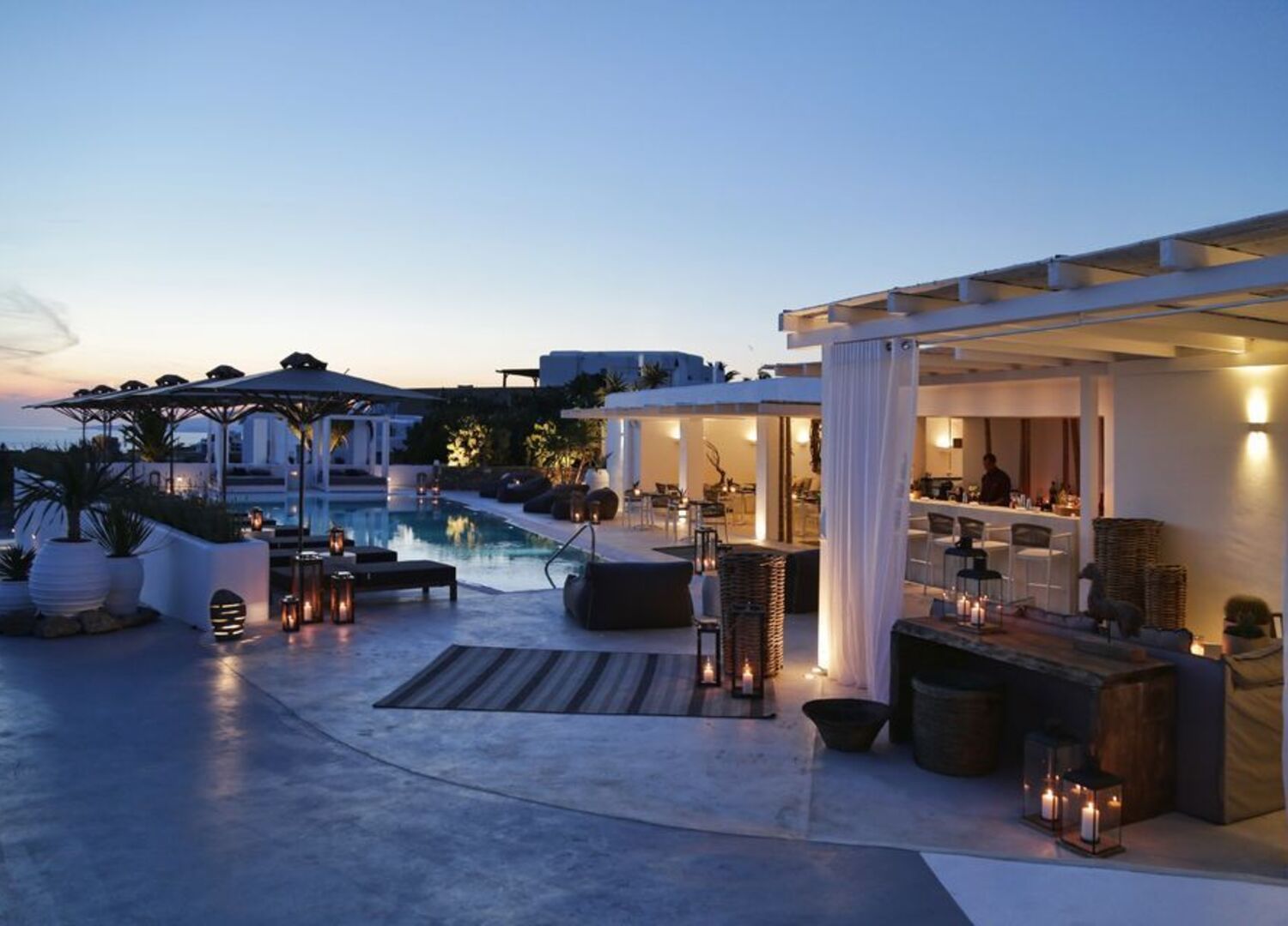 The luxury boutique hotel in the Mykonos heyday of postmodernism style, embraces its past with a transformed contemporary spirit. The Mykonian white and earthy tones and the sophisticated decoration with island elements create the perfect atmosphere for the ultimate relaxing, luxurious haven.
