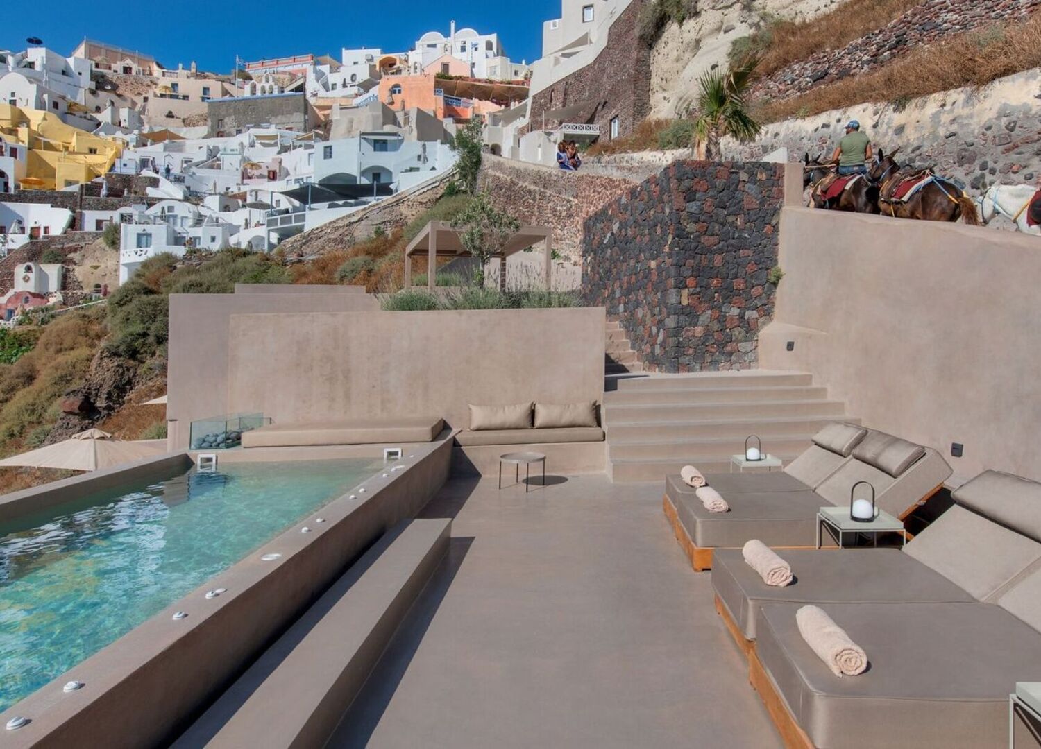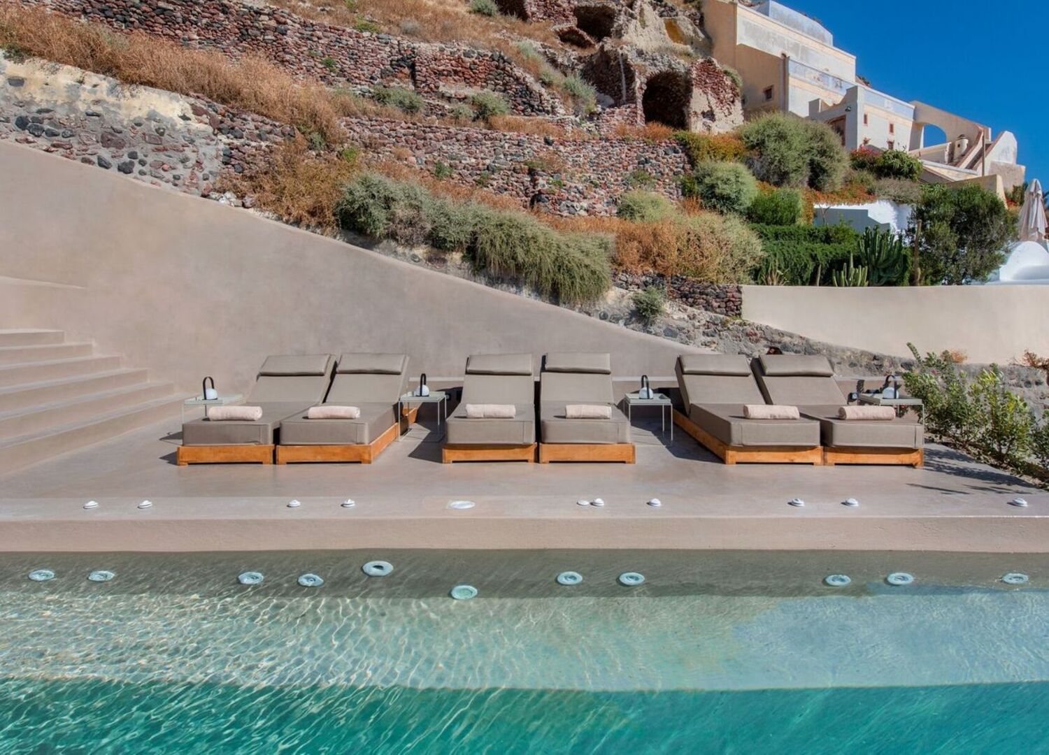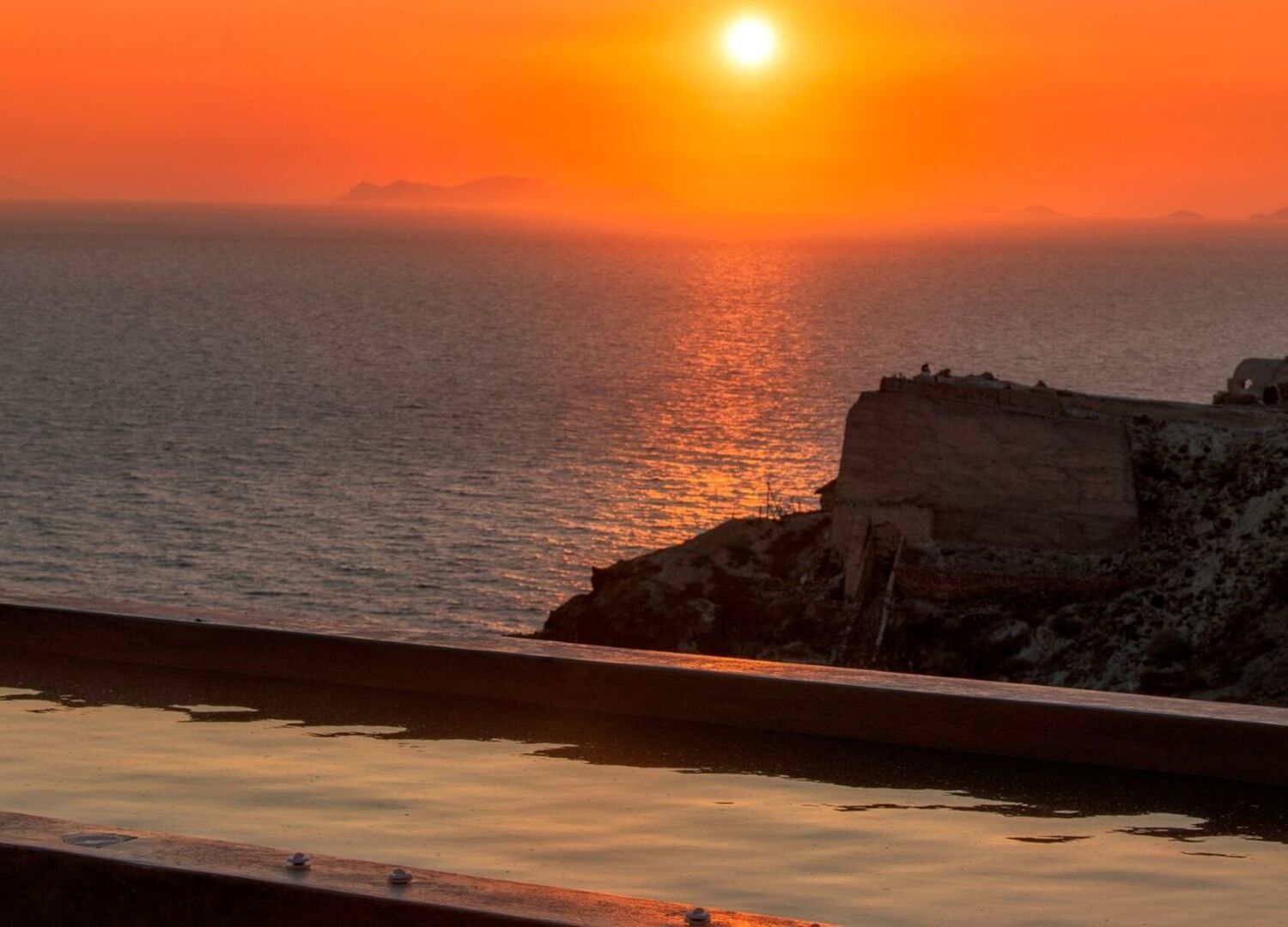 Old Castle Oia features a magnificent infinity freshwater heated pool with direct sunset view and sunbeds.