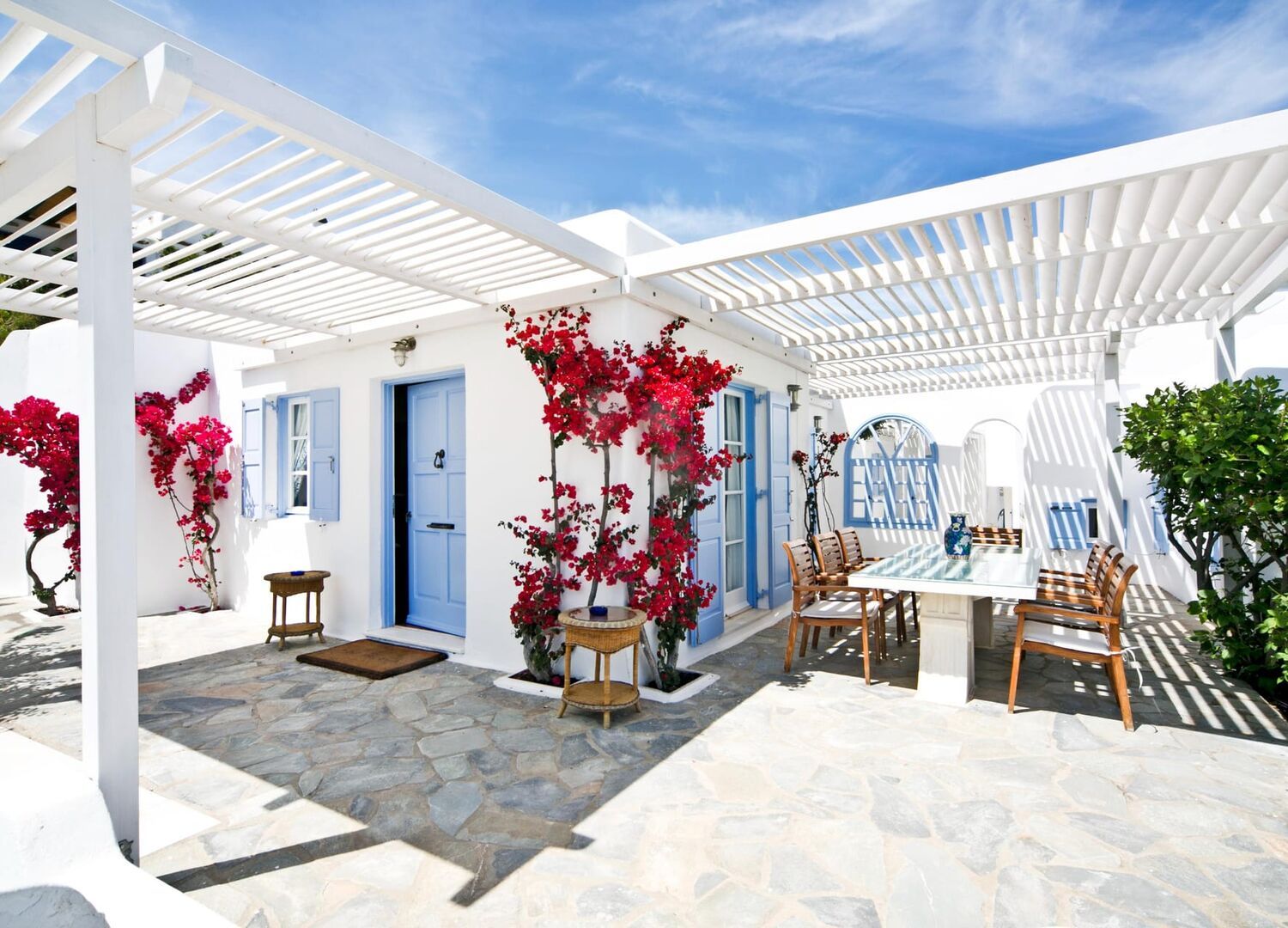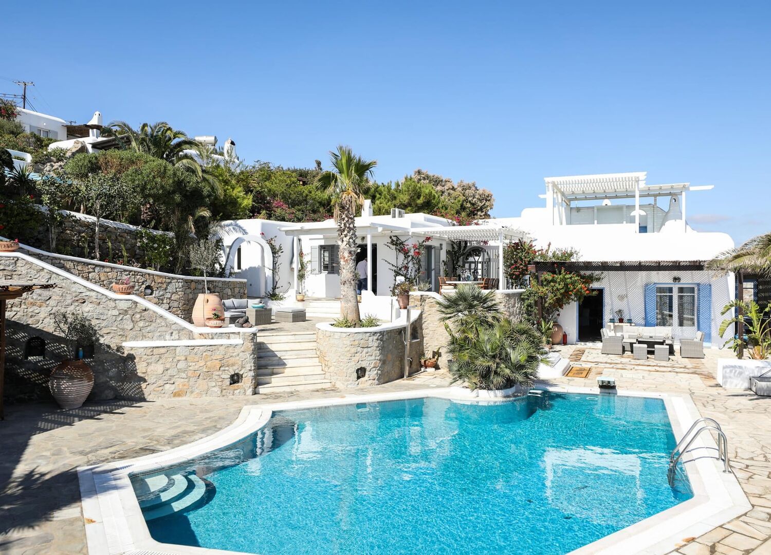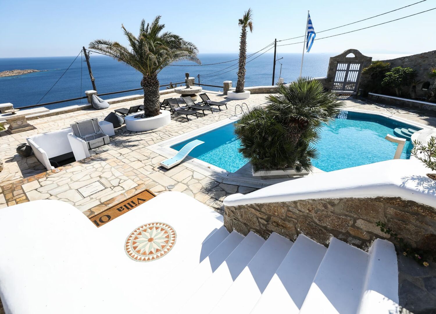 Welcome to Ozar Villas Mykonos, a captivating complex of three villas perched above the iconic Psarou Beach in Agios Lazaros. Just a brief 5-minute stroll from the sea, our villas offer panoramic views of Psarou, Platis Gialos, Agia Anna, Paraga, Paradise, and the renowned Cavo Paradiso Club, with glimpses of Naxos and Paros islands.