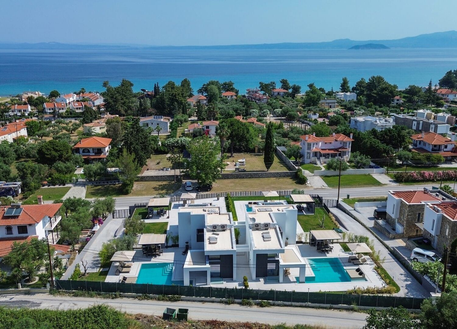 Seasalt Luxury Villas enjoy a prime location between Pefkochori and the protected NATURA area of Glarokavos. Situated just 250 meters from the sea, they offer the perfect base for easy access to the area’s stunning beaches. With direct access to the main road, you’ll be within moments of picturesque coves, pine-fringed beaches, and crystal-clear waters. Explore miles of golden beaches, swim in turquoise waters, and admire the breathtaking scenery dotted with ancient olive trees and sapphire-blue bays. The cosmopolitan village of Pefkochori is just 1.5 kilometers away and offers a wide range of upscale restaurants, trendy beach bars, and exciting water sports. Seasalt Luxury Villas are located 95 km from Thessaloniki’s Macedonia Airport and the largest shopping mall in the region, Mediterranean Cosmos.