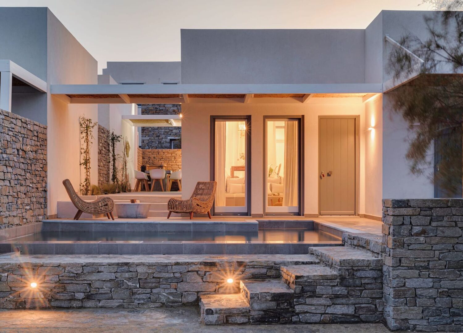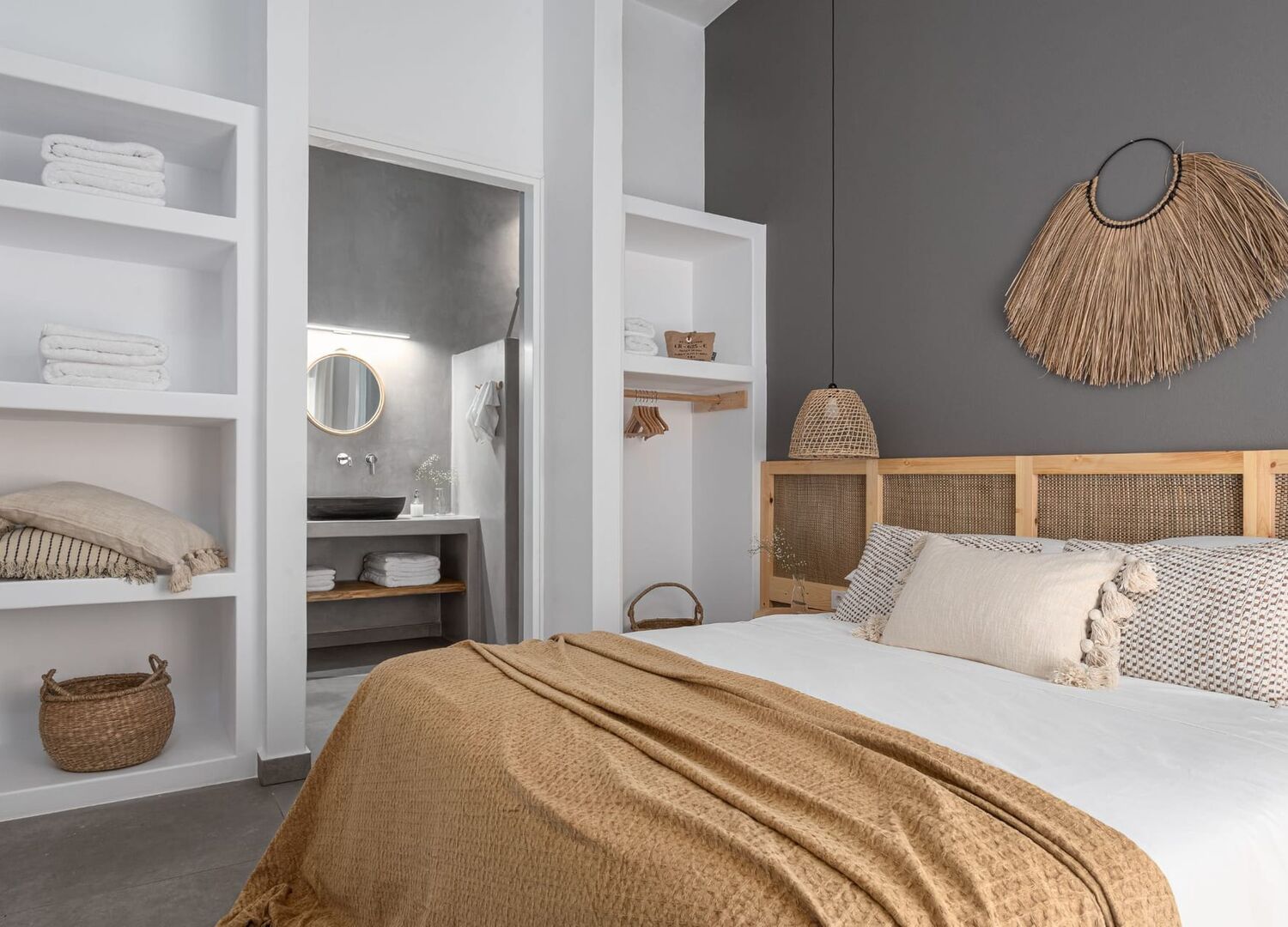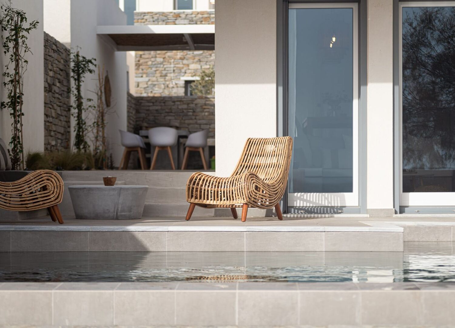 The interior is minimal in design and affluent in amenities, proposing to pamper you and help you leave everything behind. Neutral hues, well-crafted built-in furniture, Cycladic architectural details, and smooth lines create a paragon of homely luxury. The 130 sqm villa comfortably accommodates 6 guests and offers three spacious and airy bedrooms; one master bedroom with ensuite, plus one twin and one queen sharing a bathroom. All bedrooms have Smart TVs in case you’d like to enjoy a movie in bed. When in the living room guests can gaze at the sea views during the day and in the evening step outside to watch the magical sunset colors.