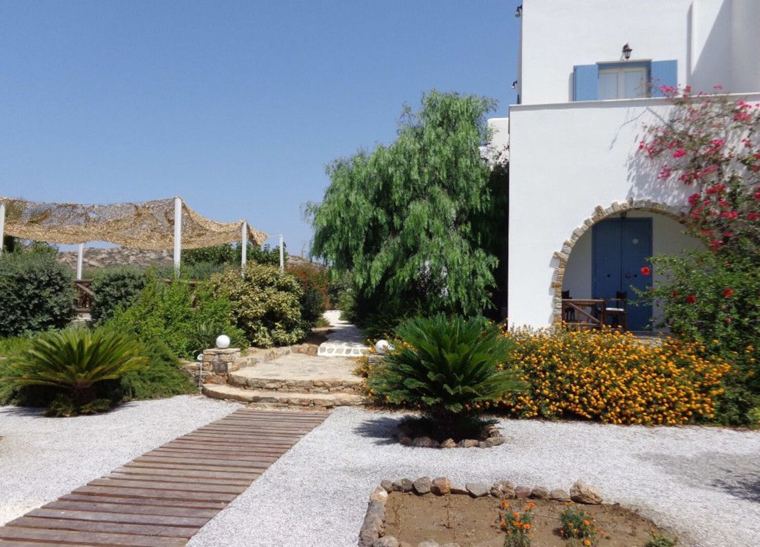 The small boutique hotel Valena Mare allows you to enjoy the tranquility and proximity to the best beach on the island while feeling like you are in a natural environment. The accommodation is accessed via a dirt road that brings you closer to the beach area, which is only a 3-minute walk away. It has common areas, an outdoor dining area for breakfast, and a swimming pool with a small bar. There are no services in the surrounding area, so if you need to do some shopping or find a place to eat, you will need to take the car and head to the Plaka beach area where the restaurants are located, about a 5-minute drive away. In this area, you can find all kinds of restaurants and a small supermarket. The hotel rooms have a special charm, resembling a small cave. You have a terrace where you can relax, a small kitchen, and a spacious bathroom with amenities. The family that runs the hotel is very friendly and attentive to all your needs. Ioannis responds to WhatsApp messages within minutes and offers excellent dining recommendations. Breakfast is not buffet style, but they have an assortment of breads, jams, cold cuts, Greek yogurt with honey (delicious), fruit, juice, and coffee. There is not a wide variety, but in our case, we did not seek it, and I am sure that if we had requested it, Ioannis would have provided us with any additional food. The hotel exudes peace and allows you to completely disconnect. It is true that it needs some refurbishment and renovation, as some areas and parts of the room are somewhat deteriorated. We spent some incredible days at your place and we would confidently recommend it to couples who want to experience the beauty of the Greek islands away from the typical tourist hotspots. Greetings from Madrid.