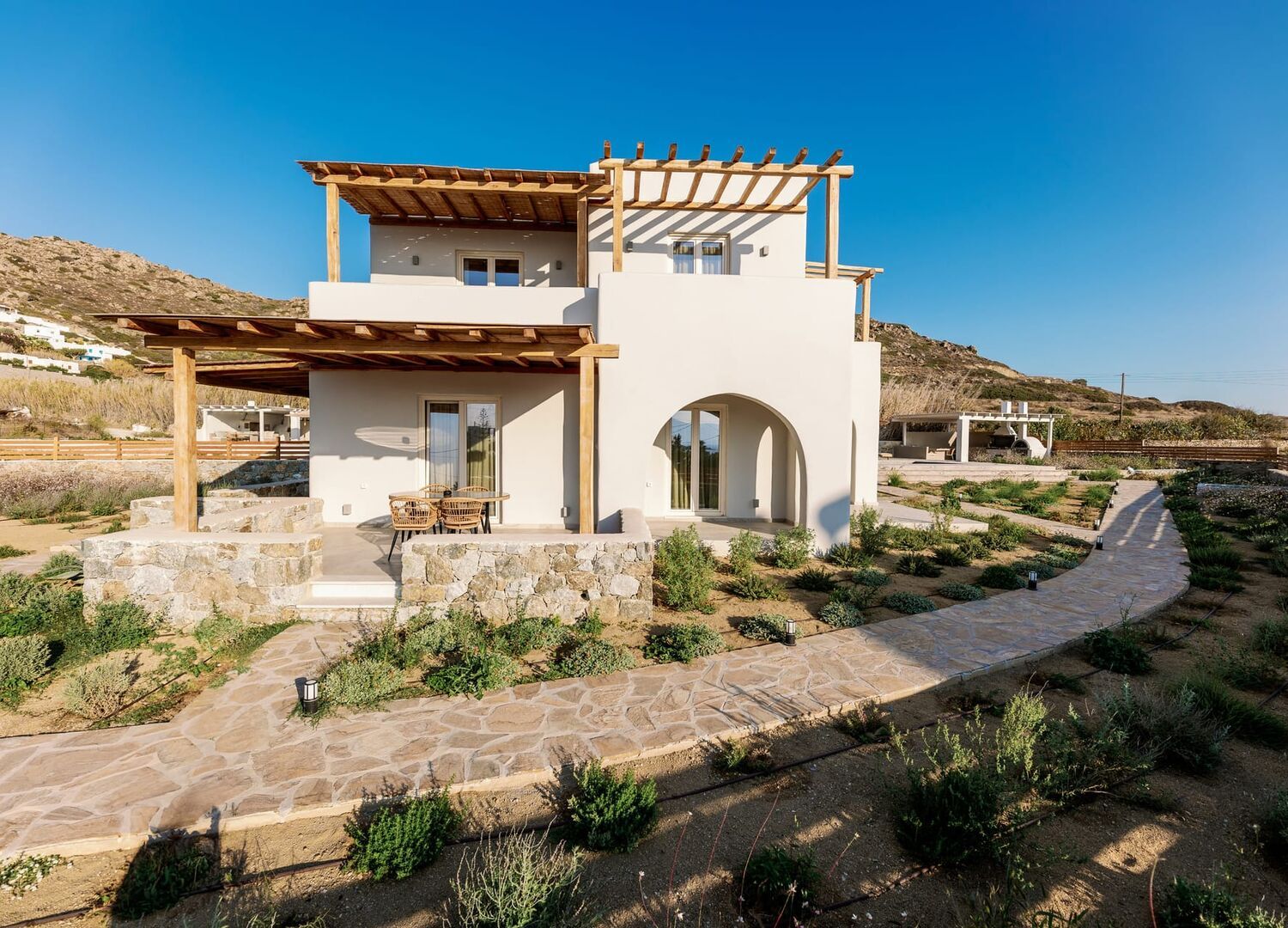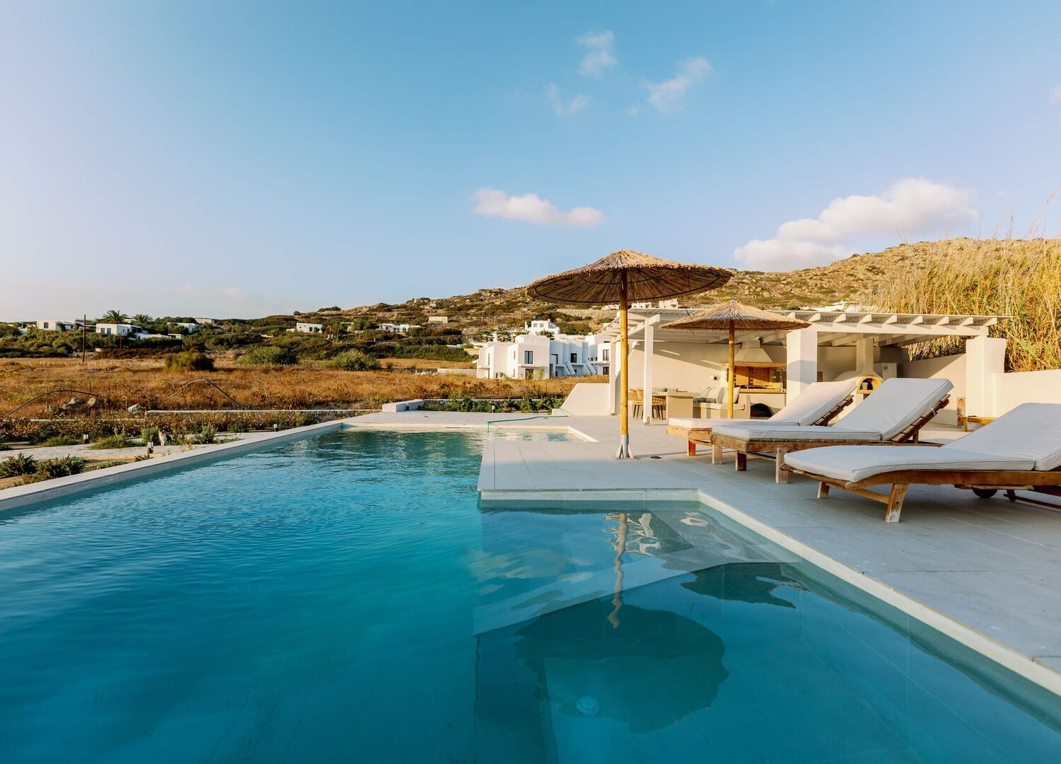 Positioned a few steps from Orkos Beach, is the epitome of luxurious living. The highlight of Villa Finest Earth is its two bathrooms, with one offering en suite facilities, providing extra comfort and privacy. Guests can enjoy a fully equipped kitchen, perfect for home-cooked meals. Outdoors, the villa offers a private pool, a charcoal BBQ, and a traditional built oven, ideal for al fresco dining. The villa also includes convenient parking for two vehicles, making travel effortless.
