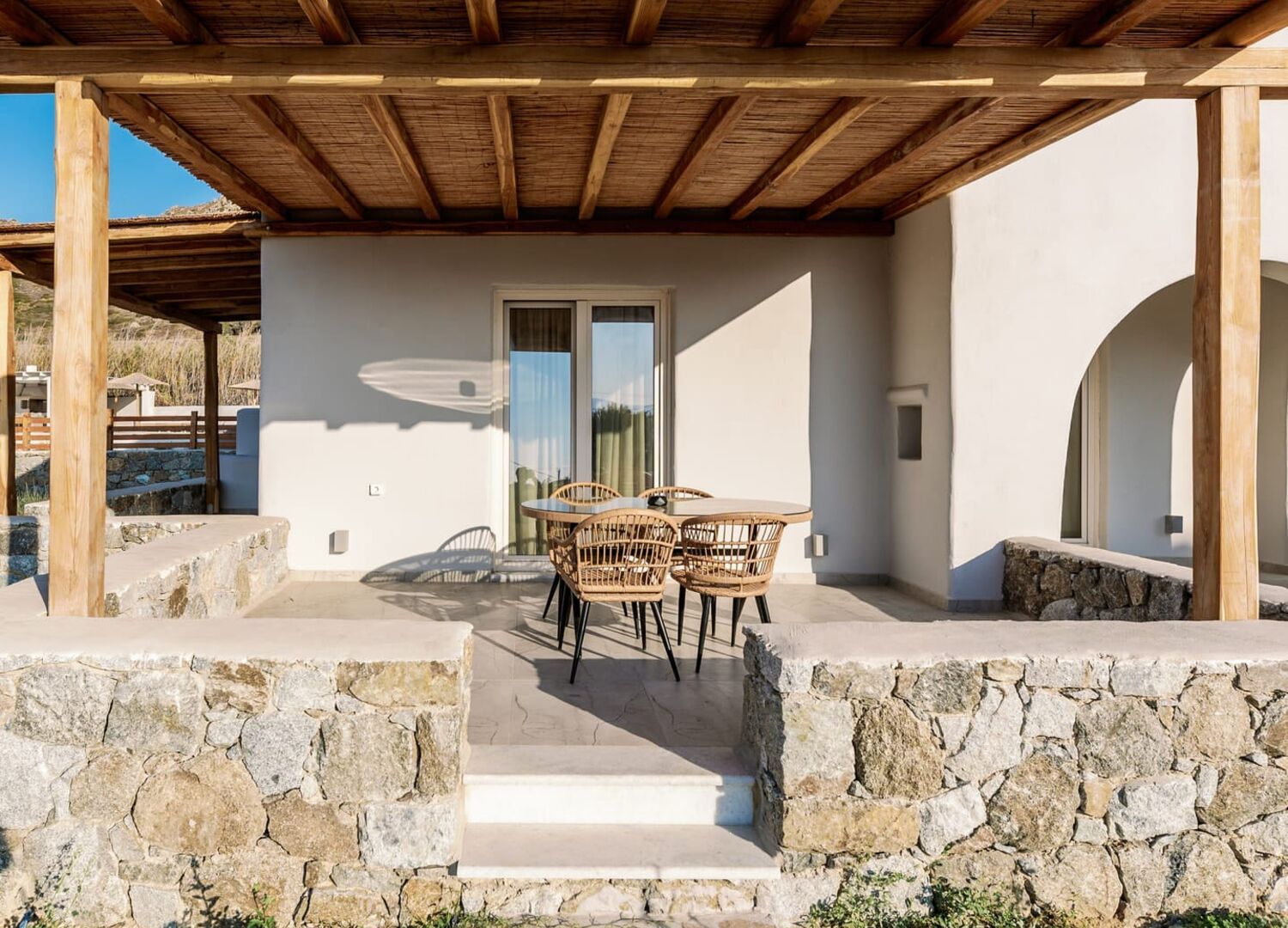 The villa’s decor includes wooden furniture and fabrics in earth tones, enhancing the Aegean atmosphere.