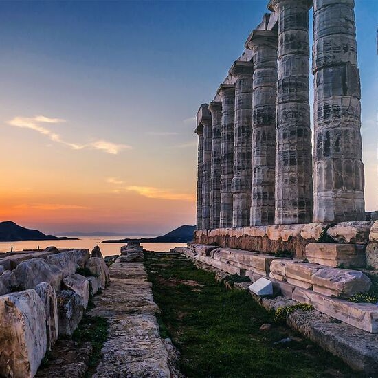 Nous atteignons le cap rocheux de Sounio lorsque le soleil est sur le point de s'immerger dans la mer Égée. Le meilleur moment pour profiter de la région pittoresque de Sounio et capturer sa beauté est le coucher du soleil. Homère lui-même parle de Sounio dans son poème épique Odyssée et de grands dirigeants comme Ménélas de Sparte se sont arrêtés à Sounio pour rendre hommage à ses compagnons. "Sounio, Cap d'Athènes.