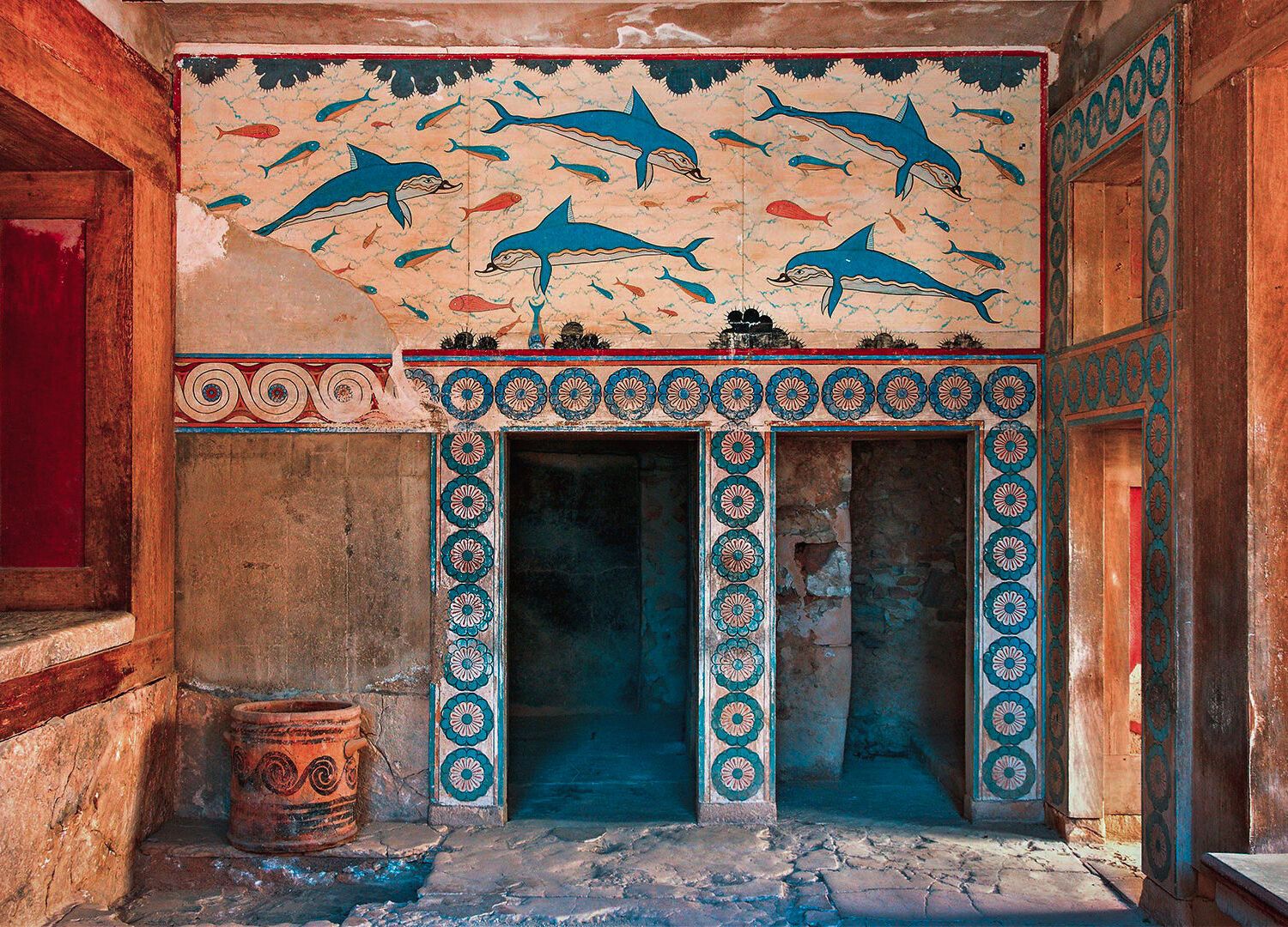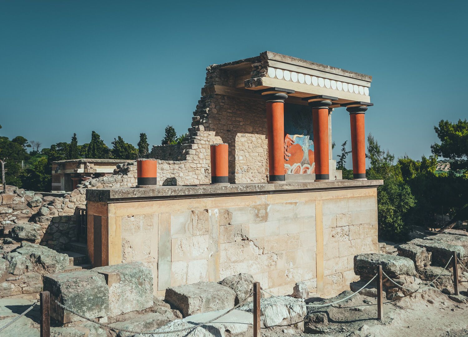 Cnossos, site du plus grand palais de la civilisation minoenne en Crète, est inextricablement lié au labyrinthe légendaire du roi Minos. Ce dernier y avait enfermé la progéniture sanguinaire des amours de son épouse, Pasiphaé, avec un taureau blanc. Le Minotaure, doté d'un corps d’homme et d'une tête de taureau, devint prisonnier du labyrinthe après que Minos eut consulté l’Oracle de Delphes. Tous les neuf ans, Athènes devait lui envoyer en pâture sept jeunes hommes et sept jeunes filles, en guise de punition pour la guerre qu’elle avait menée (et perdue) contre les Minoens.
