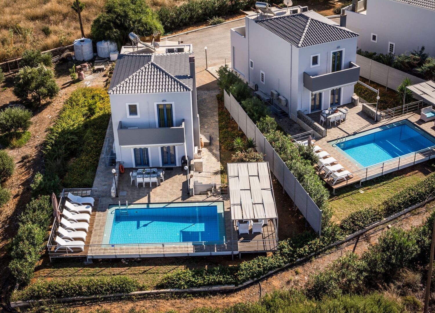 Akron Villas Chania offers 3 identical three-storey detached buildings of 180sqm each, build in 2006, on a fenced plot of 4000sqm located on the Akrotiri Peninsula in Chania, Crete, Greece. Each villa has a private pool of 30sqm, and can accommodate 8+ with 4 bedrooms, 1 full bathroom, 1 en-suite shower, toilette wc, open plan living-kitchen-dining area. The basement, with own outside entrance, has 1 bedroom 2 single beds, sofas, seating area and a gym. Open space living, dining area, fully equipped kitchen. Air-conditioning in all areas, free WiFi, flat-screen TV, veranda w mountain views and balcony overlooking the pool and sea views.