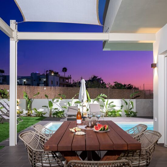 Gournes - Newtown Residences offers two private villas with stylish decor, private swimming pools, and a focus on comfort, elegance, and privacy. Each villa is 80 sq.m. and can accommodate up to 6 adults, with 2 bedrooms, 2 bathrooms, a modern fully equipped kitchen, and a spacious living room with a pool view. Located in Gournes Crete on Dimokratias Ave.
